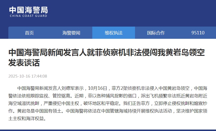 菲律宾2架侦察机非法侵入中国黄岩岛领空 中国海警跟踪监视、管控驱离