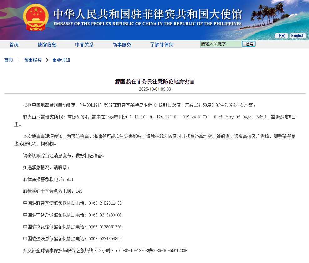 中国驻菲律宾大使馆提醒在菲中国公民注意防范地震灾害