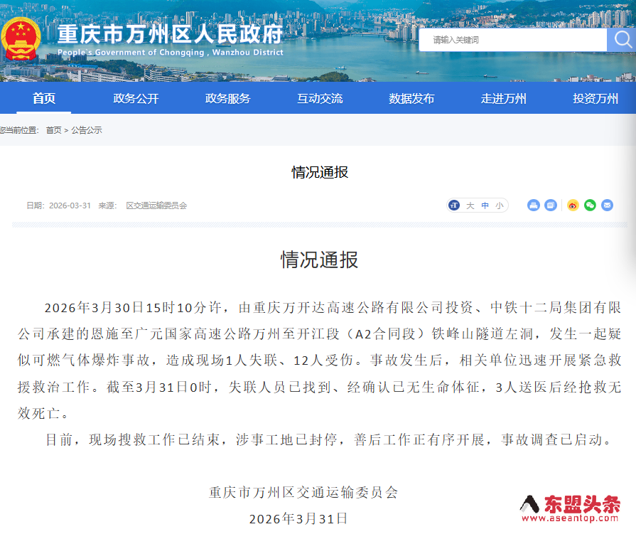中国重庆一在建隧道发生爆炸事故致4人死亡 涉事工地已封停
