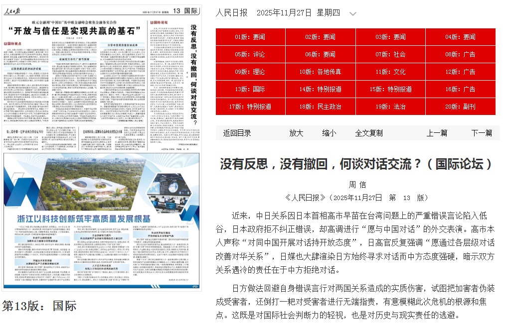 中国官媒《人民日报》发文:日方没有反思没有撤回 何谈对话交流