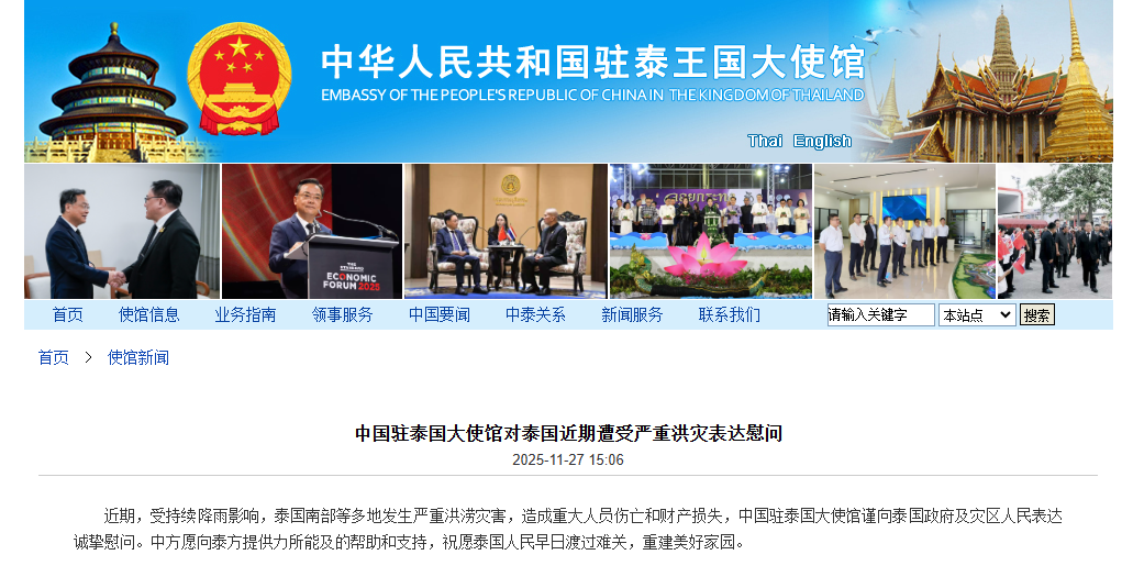 中国驻泰国大使馆对泰国近期遭受严重洪灾表达慰问