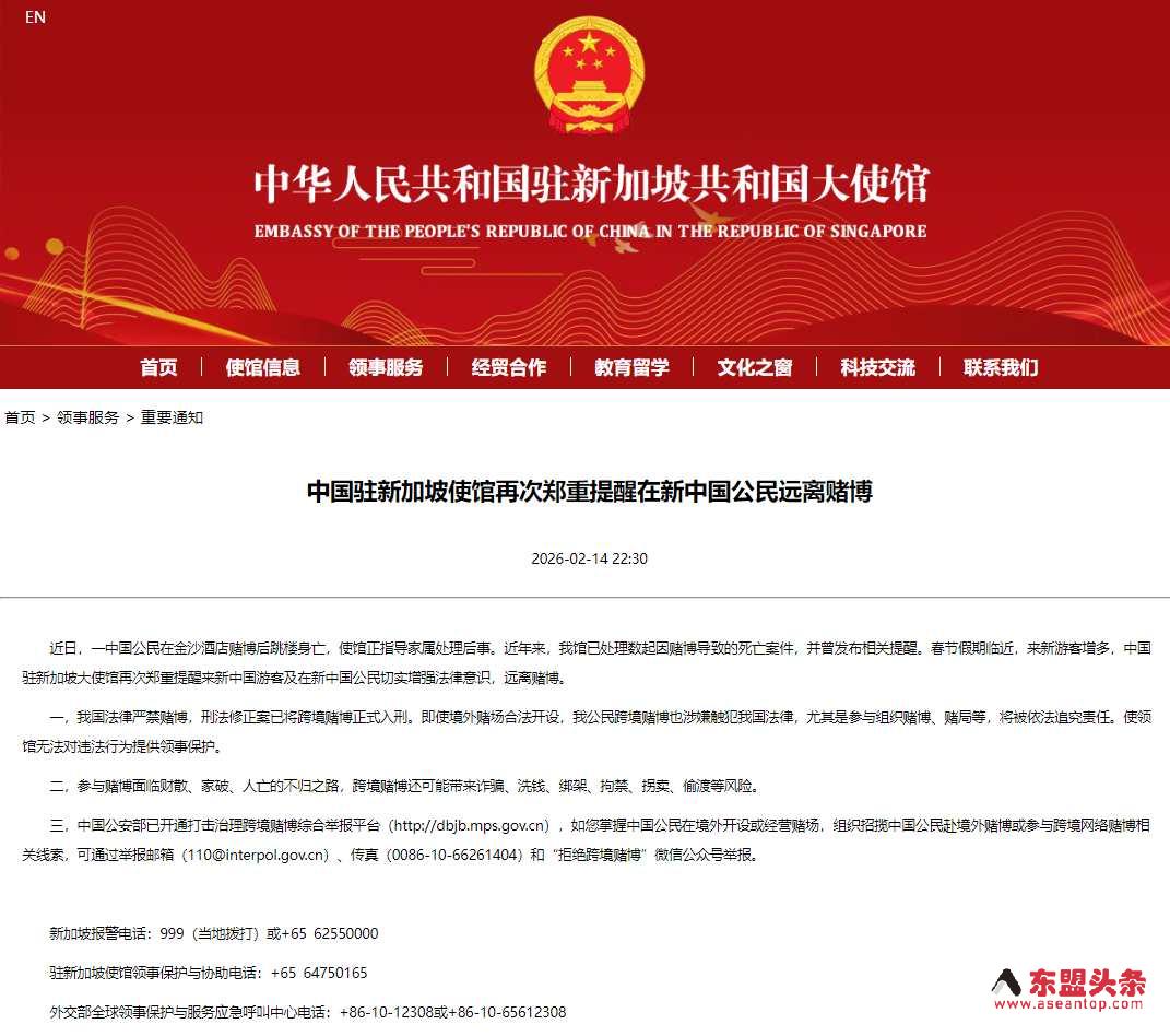 一中国公民在新加坡酒店赌博后跳楼身亡 中国使馆再次提醒中国公民远离赌博
