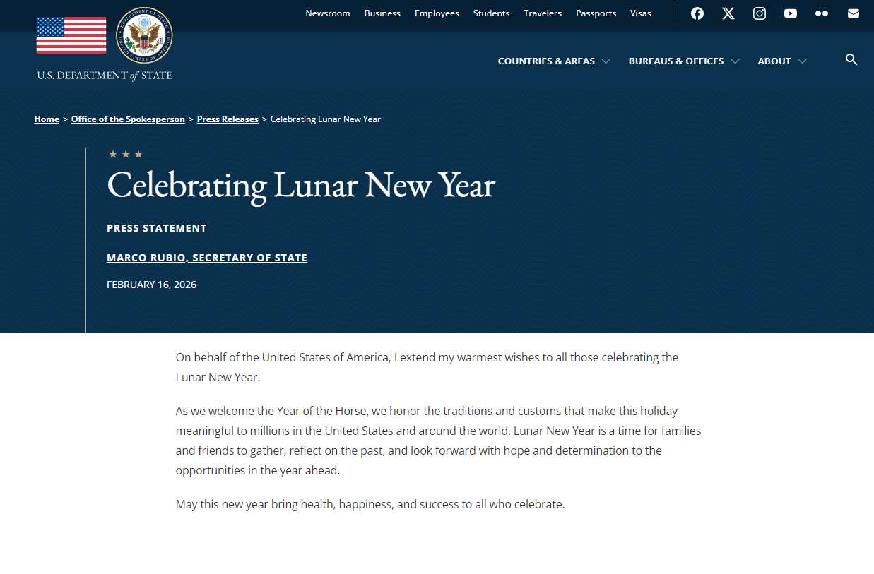 美国国务卿鲁比奥发表声明祝贺农历新年