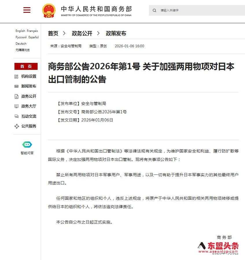 中国决定禁止所有军民两用物项向日本军事用户、军事用途出口