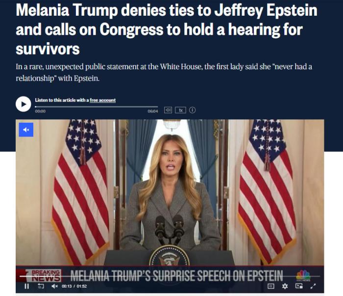 美国第一夫人发声明:否认与爱泼斯坦及其罪行有任何关联