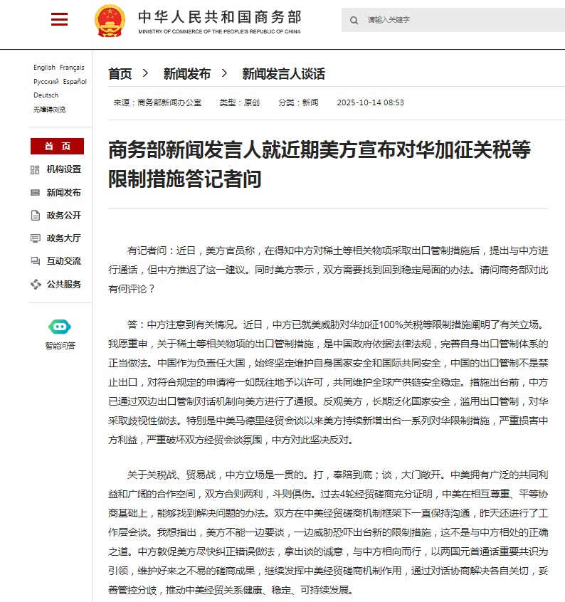 发言人重申,关于稀土等相关物项的出口管制措施,是中国政府依据法律法规,完善自身出口管制体系的正当做法。中国作为负责任大国,始终坚定维护自身国家安全和国际共同安全,中国的出口管制不是禁止出口,对符合规定的申请将一如既往地予以许可,共同维护全球产供链安全稳定。措施出台前,中方已通过双边出口管制对话机制向美方进行了通报。反观美方,长期泛化国家安全,滥用出口管制,对华采取歧视性做法。特别是中美马德里经贸会谈以来美方持续新增出台一系列对华限制措施,严重损害中方利益,严重破坏双方经贸会谈氛围,中方对此坚决反对。