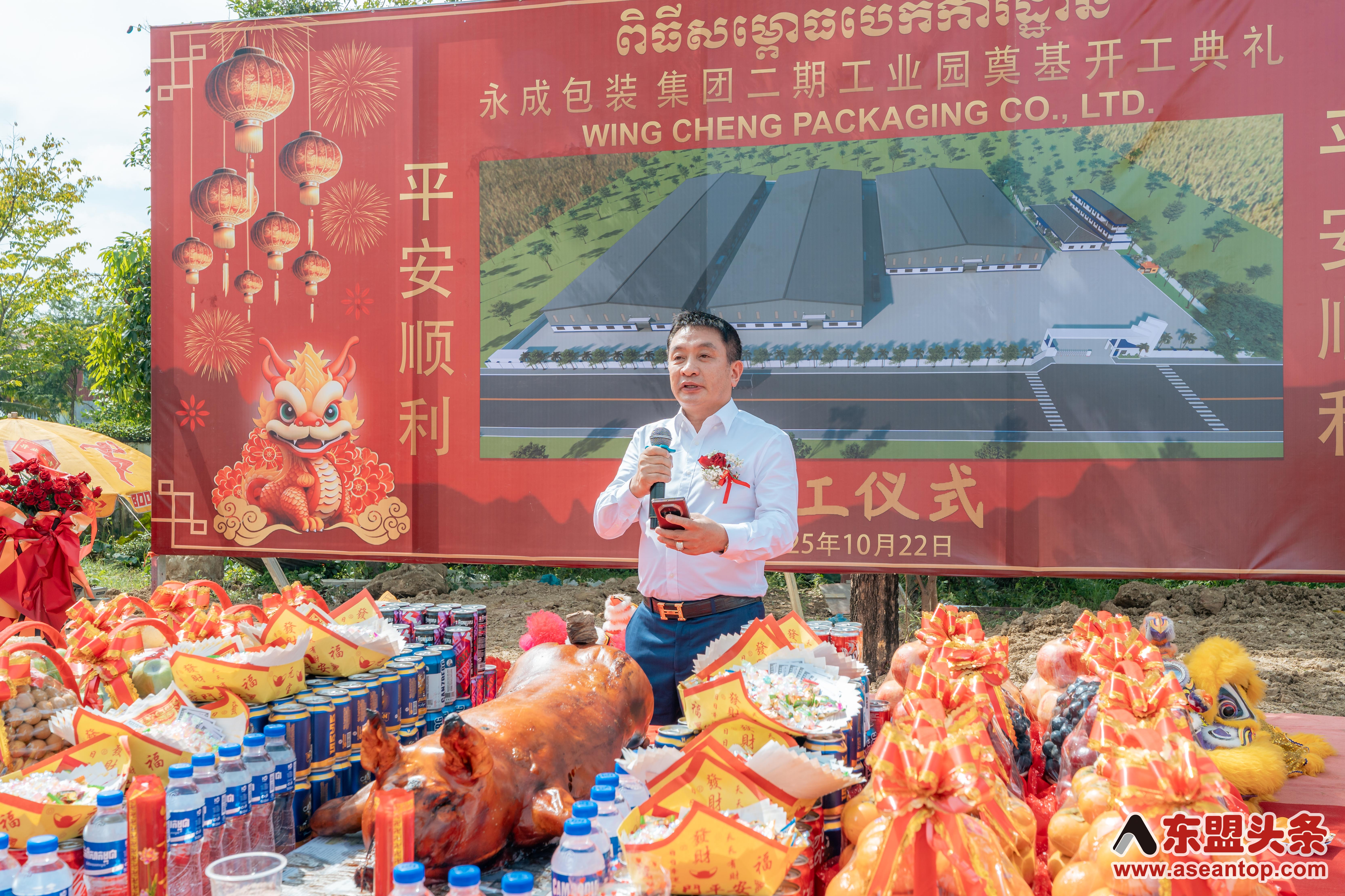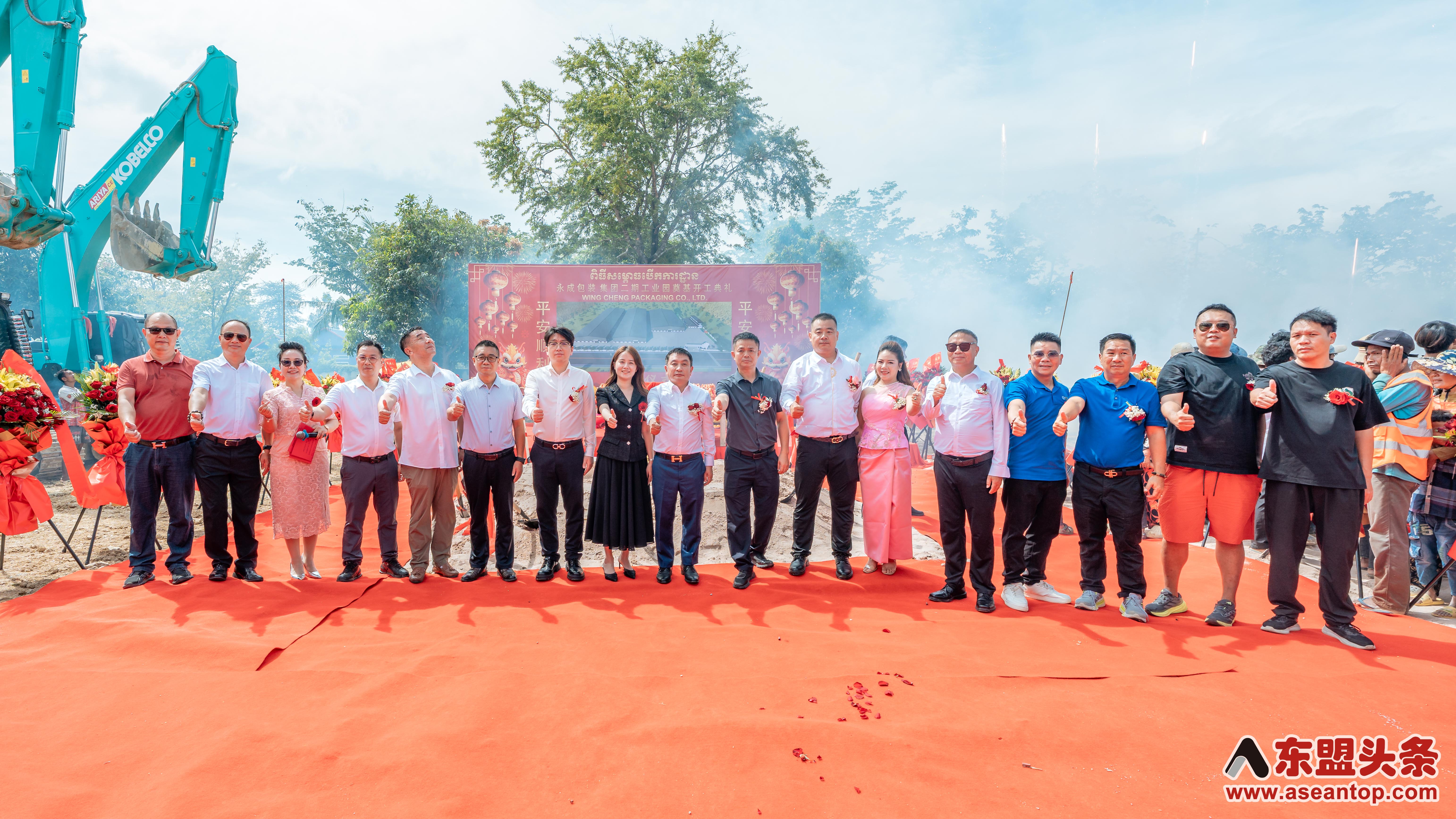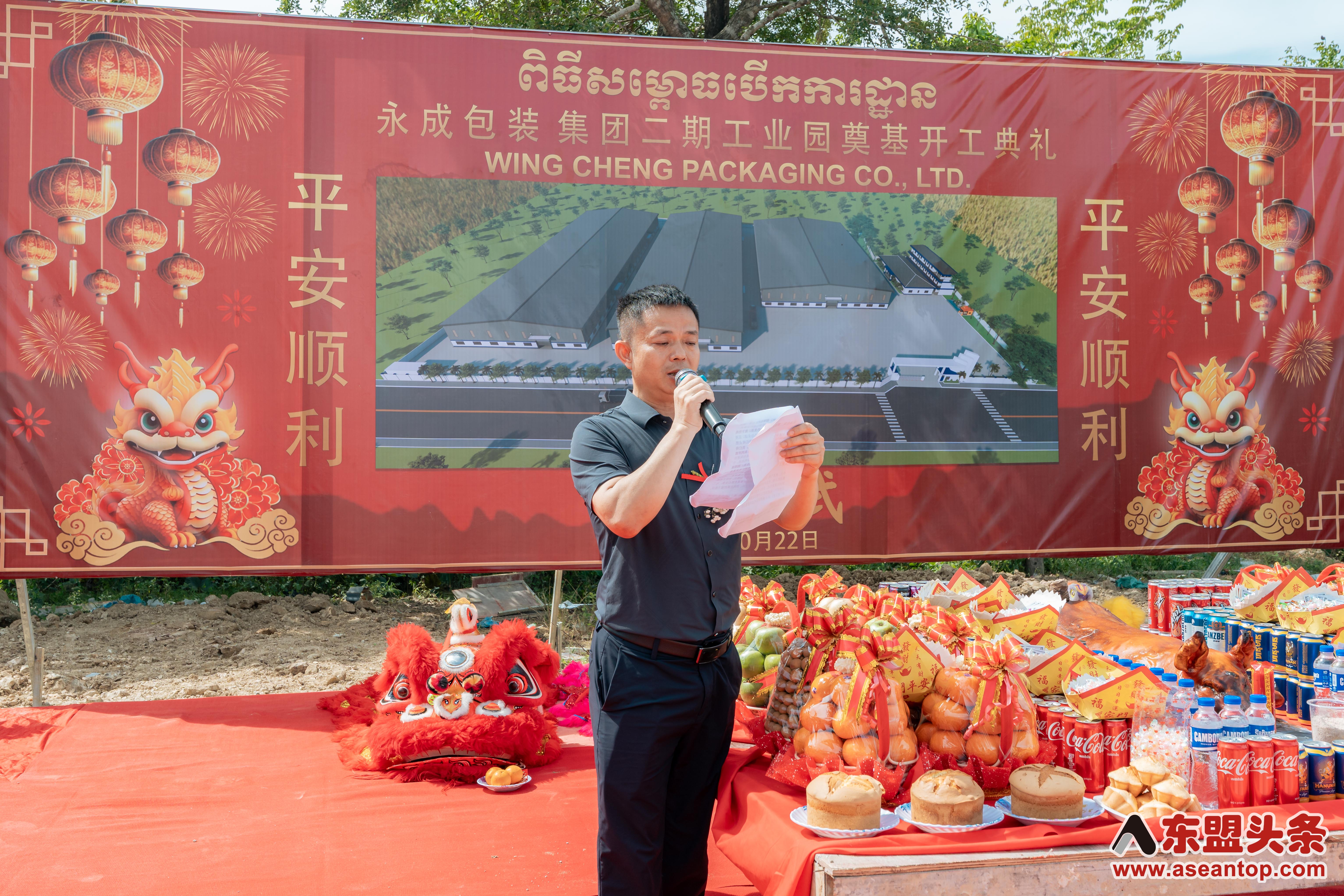 东盟头条电 10月22日上午,中资企业柬埔寨永成包装集团二期工业园奠基开工典礼在柬埔寨4号公路(金边至西哈努克港)28公里处项目现场隆重举行,永成包装集团董事长郑贤江、执行董事刘建华出席仪式并致辞。