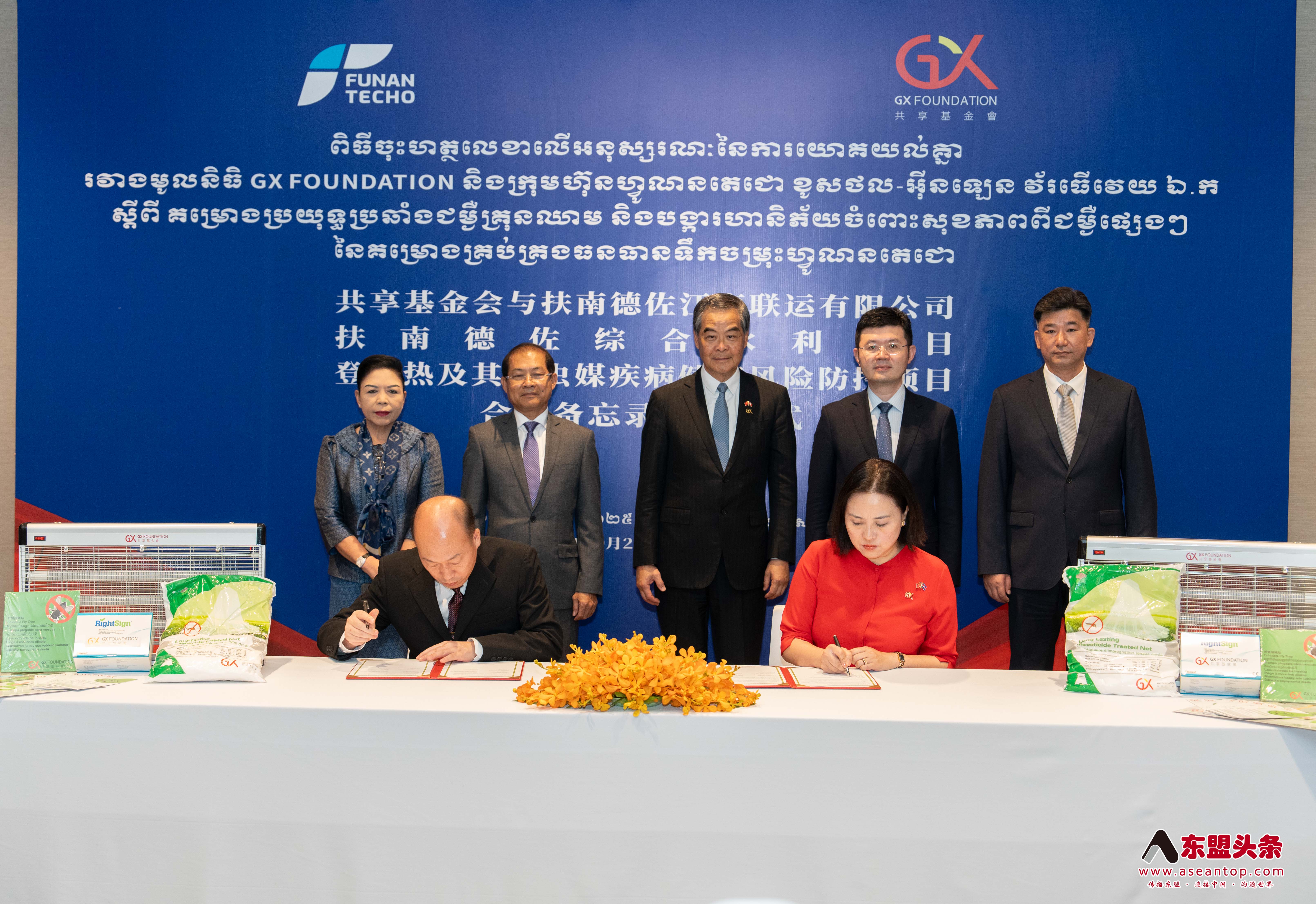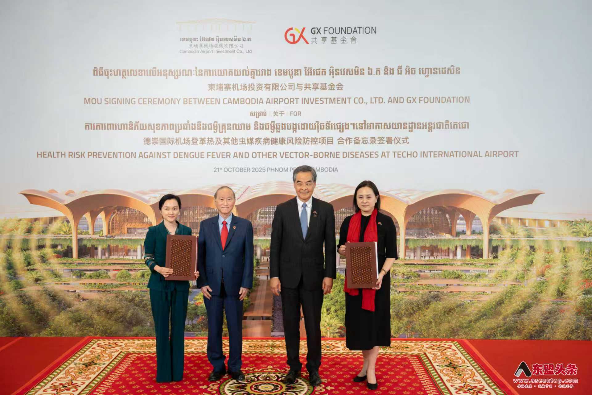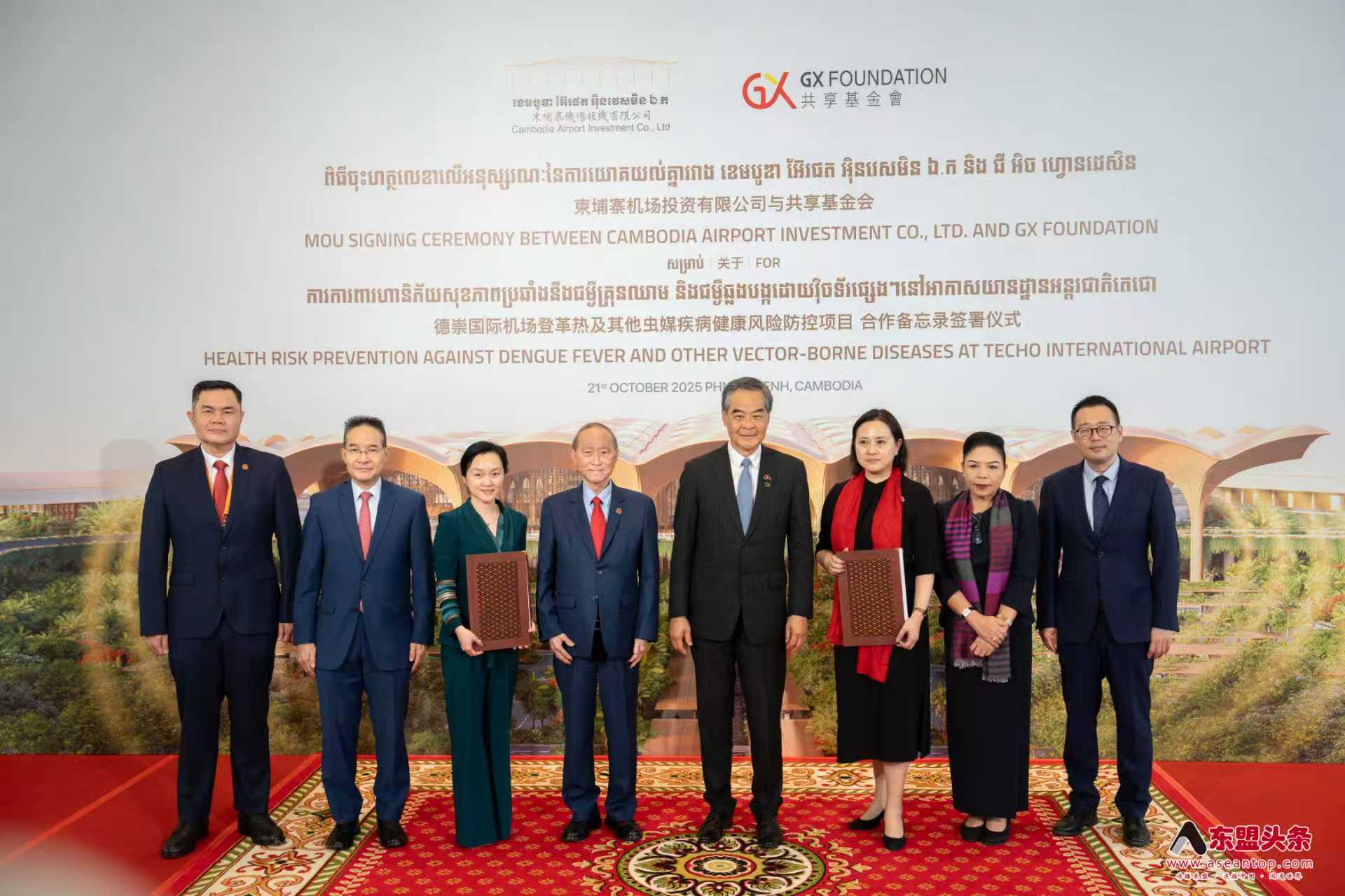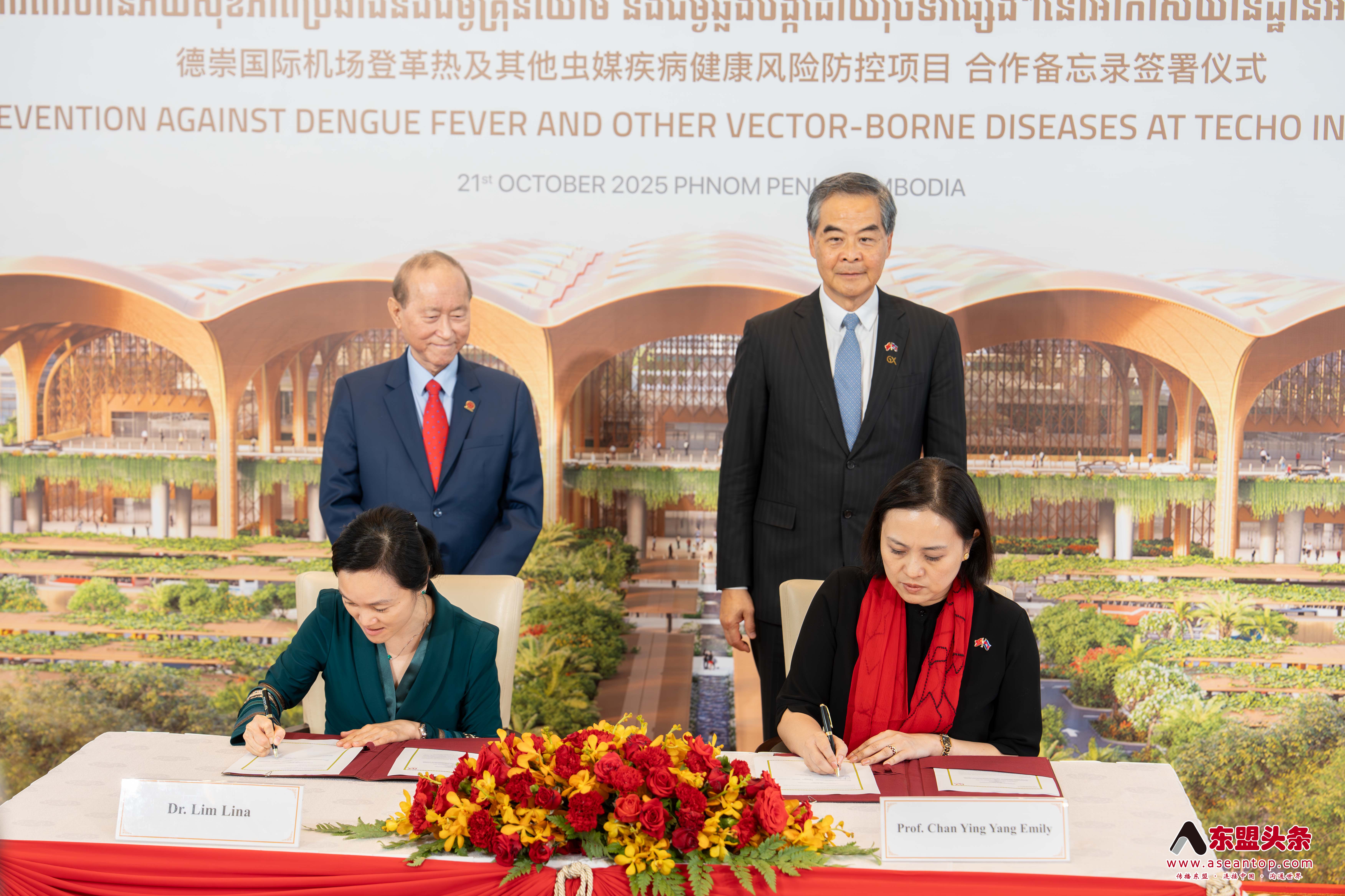 东盟头条电 香港共享基金会于10月21日分别与柬埔寨机场投资有限公司及扶南德佐江海联运有限公司签署“登革热及其他虫媒疾病健康风险防控项目”合作备忘录,将在德崇国际机场及扶南德佐综合水利项目开展系统的病媒防控工作。
