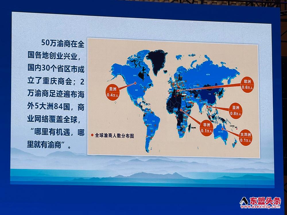 根据统计,50万渝商在中国各地创业兴业,中国国内30个省区市成立重庆商会;2万渝商足迹遍布海外5大洲84个国家,包括柬埔寨、泰国、缅甸、越南、马来西亚等东盟国家,商业网络覆盖全球,“哪里有机遇,哪里就有渝商”。