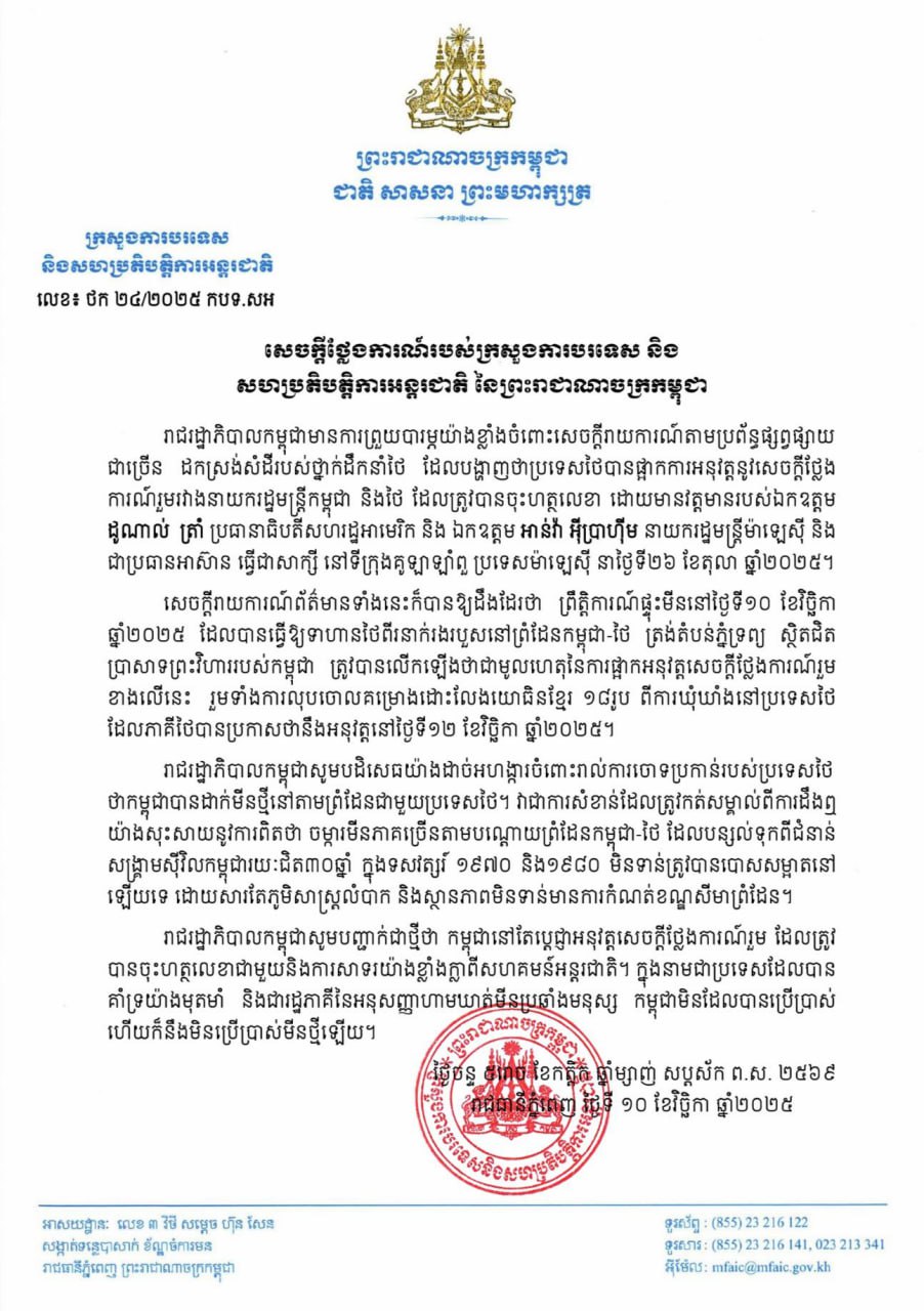 声明称,2025年11月10日在柬埔寨-泰国边境金边山(位于柬埔寨柏威夏寺附近)发生一起地雷爆炸事件,导致两名泰国士兵受伤。泰国方面表示,此为暂停执行联合声明并取消原定发布会的原因。截至2025年11月12日,仍有18名柬埔寨士兵被泰国方面拘留。