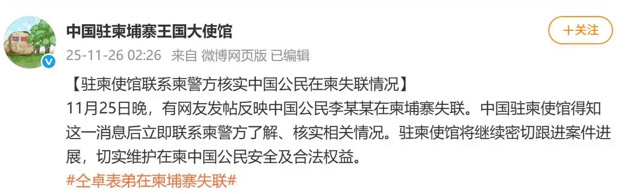 11月26日凌晨2时许,中国驻柬埔寨大使馆发消息称,已联系柬警方核实中国公民在柬失联情况。中国驻柬使馆表示,将继续密切跟进案件进展,切实维护在柬中国公民安全及合法权益。