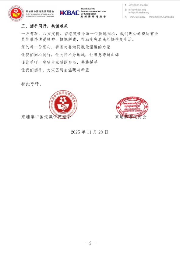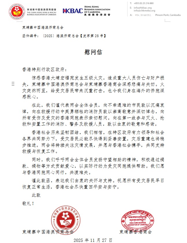 慰问信称,惊悉香港大埔宏福苑发生五级火灾,造成重大人员伤亡与财产损失,柬埔寨中国港澳侨商总会与柬埔寨香港商会深感悲痛与关切。火灾突然而至,给受灾居民带来沉重打击,也令我们身在海外的侨胞深感揪心。