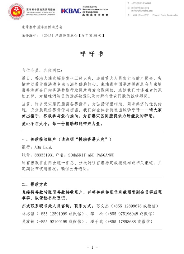 东盟头条电 中国香港大埔宏福苑11月26日发生严重火灾造成重大人员伤亡,柬埔寨中国港澳侨商总会、柬埔寨香港商会11月27日联合向香港特区政府致信慰问,并发起募捐。