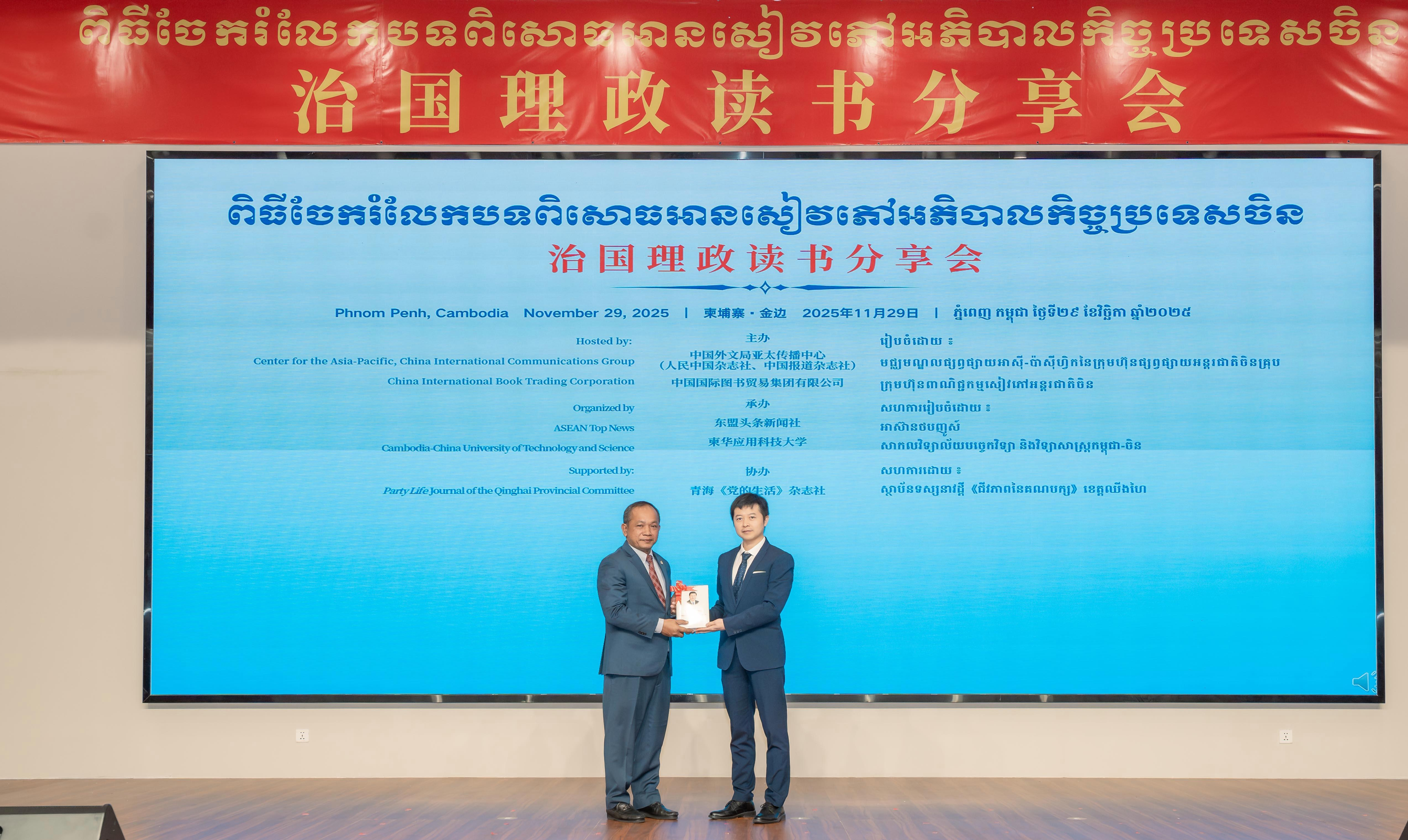11 月 29 日,由中国外文局亚太传播中心(中国报道杂志社、人民中国杂志社)、中国国际图书贸易集团有限公司联合主办,东盟头条新闻社、柬华应用科技大学承办,青海《党的生活》杂志社协办的治国理政读书分享会在柬埔寨金边举行,来自中柬两国政界、商界、学界及华人华侨代表等150余人参加。