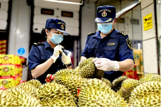 东兴海关关员正在对从东兴口岸北仑河二桥进口的越南榴莲开展海关查验 摄影 何璐璐