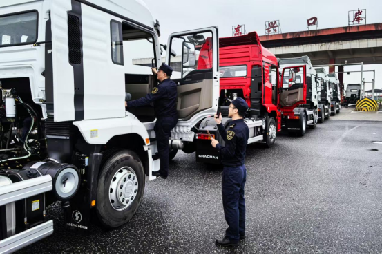 东兴海关关员正在对从东兴口岸北仑河二桥出口的50多辆国产的货车整车开展登临检查 摄影 何璐璐
