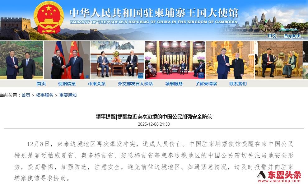 东盟头条电 中国驻柬埔寨大使馆12月8日晚间发布领事提醒,提醒靠近柬泰边境的中国公民加强安全防范。