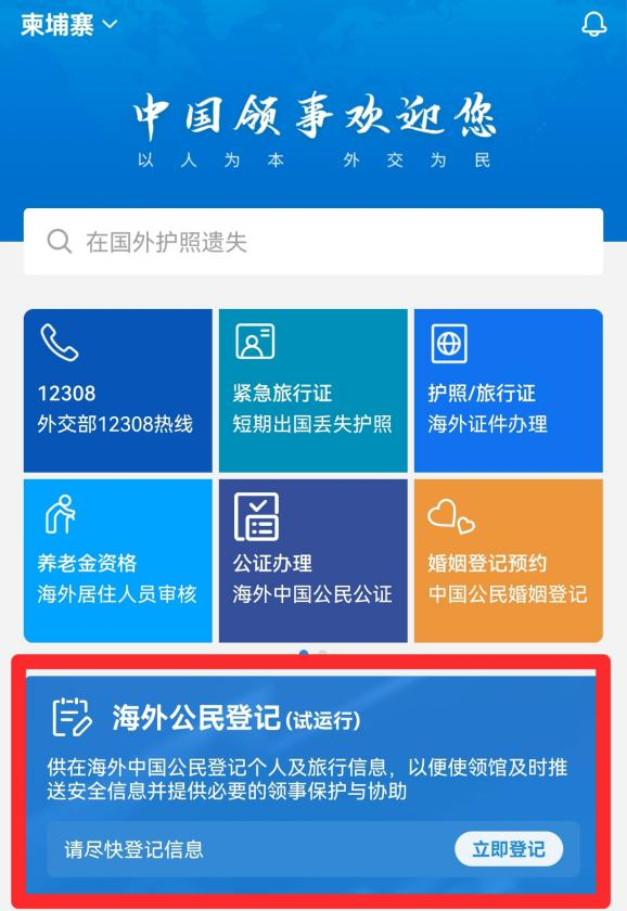 为充分发挥信息化手段优势,帮助中国公民更好获得领事保护与服务,请在柬中国公民积极下载“中国领事”APP或通过“中国领事”微信小程序参与“海外公民登记”。请确保所填个人信息真实、准确、完整,所填信息将受到严格保护。驻柬使馆将根据信息登记情况,有针对性地推送安全信息,为在柬中国公民提供及时、有效的领事保护与协助。
