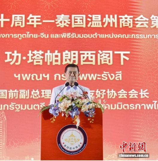 泰国前副总理功·塔帕朗西在致辞中指出,泰中两国山水相连、情谊深厚,政治互信、经济融合、人文交流日益深化,友好合作如湄南河与长江奔流不息。温州人以敢为人先、善于创业著称,温州商会长期团结温商、服务乡亲,积极推动泰中经贸与文化交流,贡献卓著。