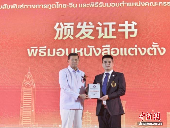 功·塔帕朗西(左)为泰国温州商会执行会长陈敏(右)颁发聘任书。主办方供图