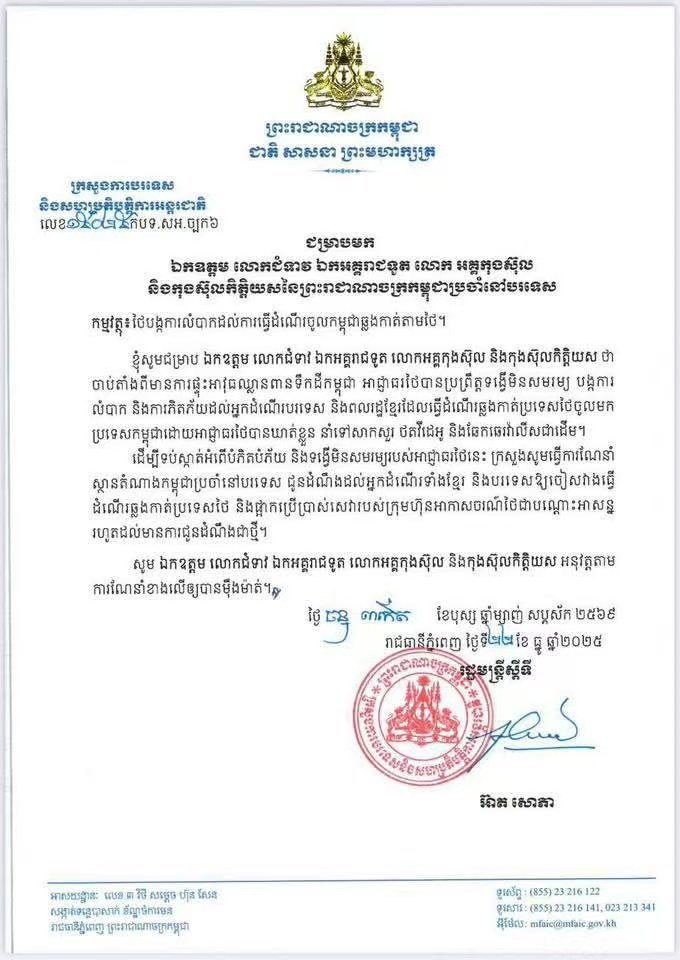 公函内容显示,自2025年柬泰边境冲突以来,泰国当局对途经泰国的外国旅客及柬埔寨公民采取的系列不当行为。公函指出,这些行为包括被拘留、接受讯问、被拍摄视频以及行李被搜查等,给相关人员造成了困难与恐惧。