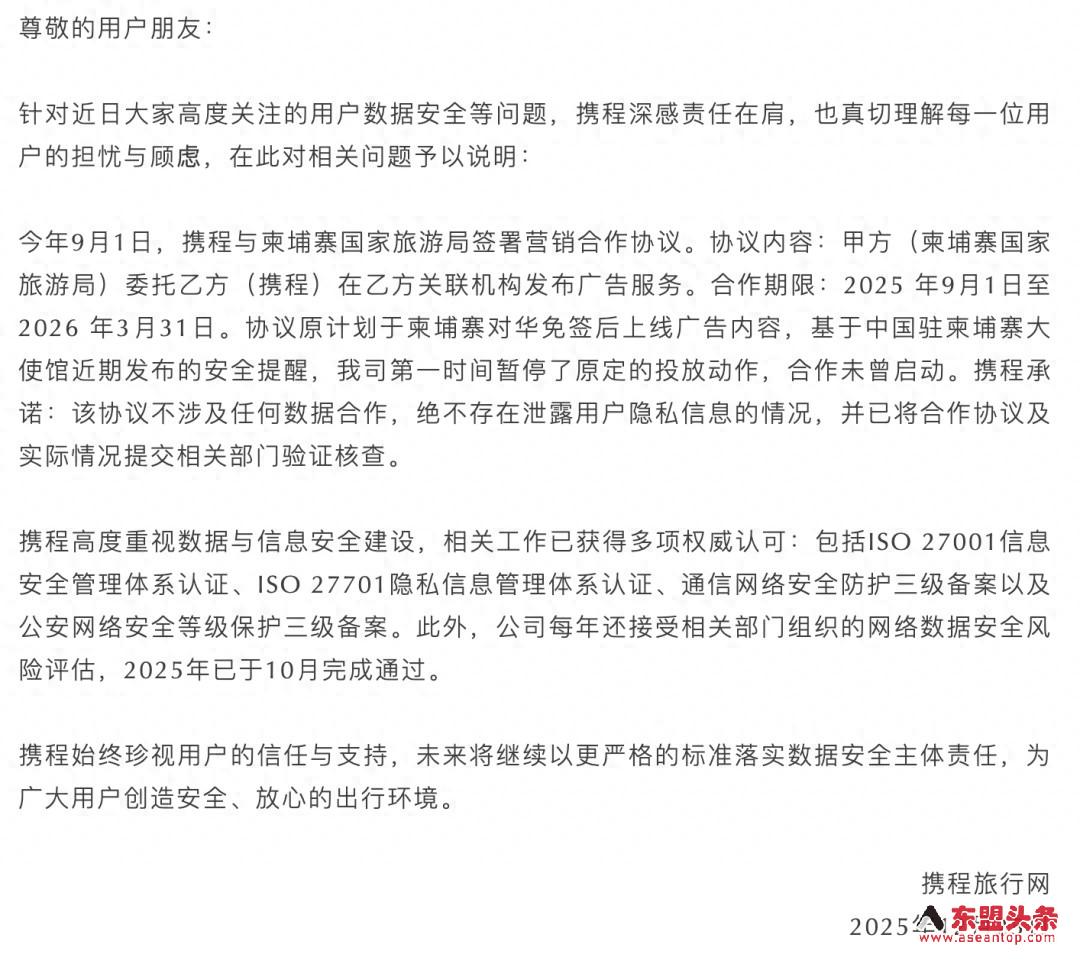 声明称,今年9月1日,携程与柬埔寨国家旅游局签署营销合作协议。协议内容:甲方(柬埔寨国家旅游局)委托乙方(携程)在乙方关联机构发布广告服务。合作期限:2025年9月1日至2026年3月31日。协议原计划于柬埔寨对华免签后上线广告内容,基于中国驻柬埔寨大使馆近期发布的安全提醒,携程第一时间暂停了原定的投放动作,合作未曾启动。携程承诺:该协议不涉及任何数据合作,绝不存在泄露用户隐私信息的情况,并已将合作协议及实际情况提交相关部门验证核查。