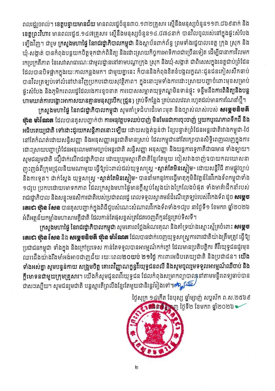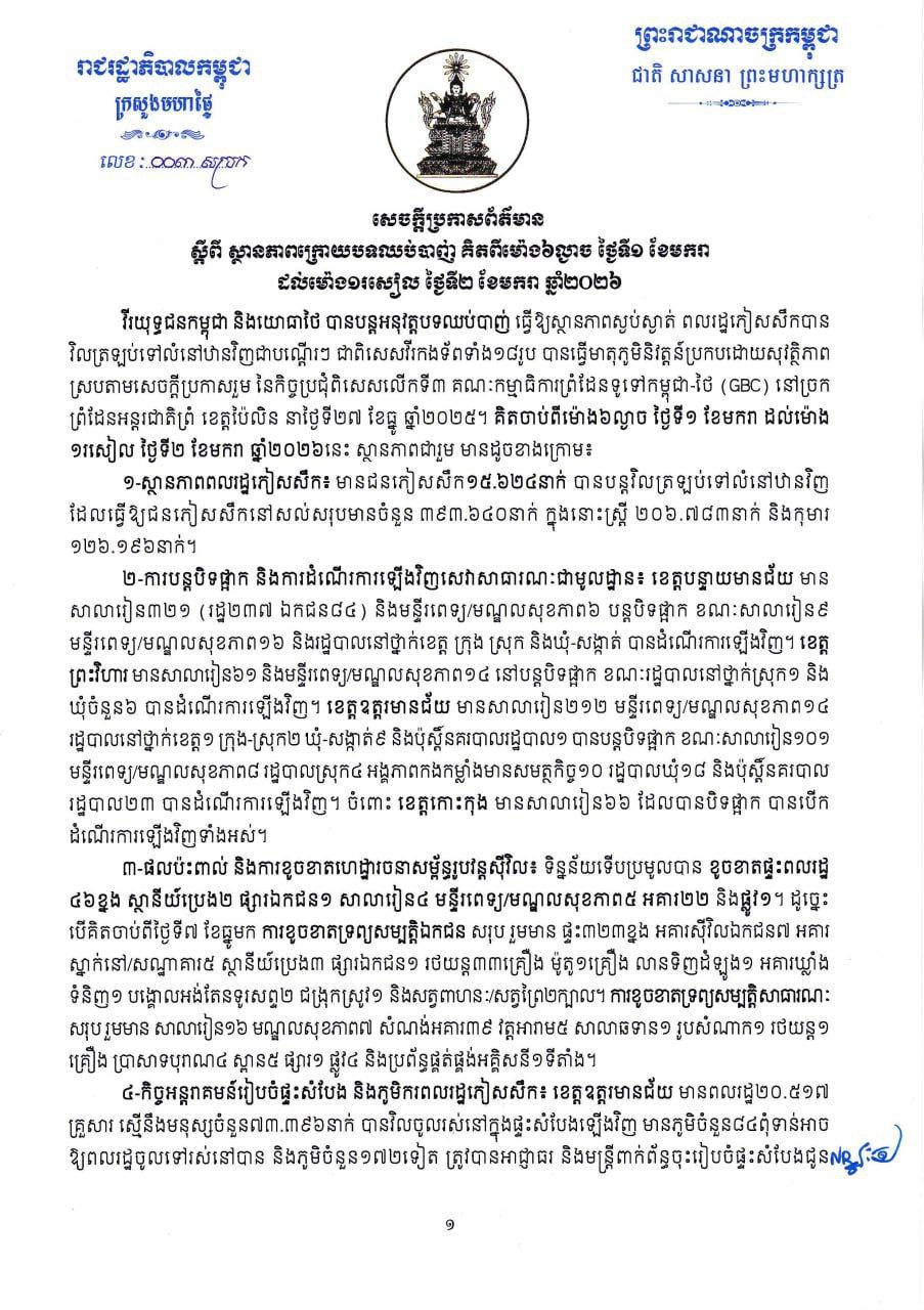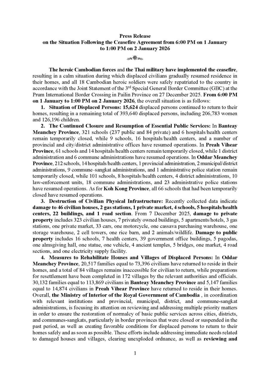2026年1月2日下午,柬埔寨内政部发布报告称,自1月1日下午6时至1月2日下午1时,共有15,624名难民返回家园。目前剩余难民总数为393,640人,包括女性206,783人、儿童126,196人。