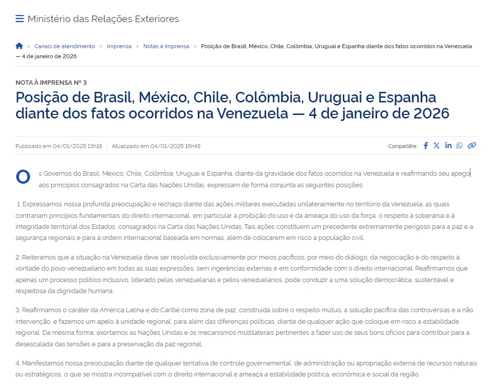 巴西外交部1月4日发表六国联合声明称,鉴于委内瑞拉事件的严重性,巴西、墨西哥、智利、哥伦比亚、乌拉圭和西班牙政府重申它们对《联合国宪章》各项原则的承诺,共同表示下列立场: