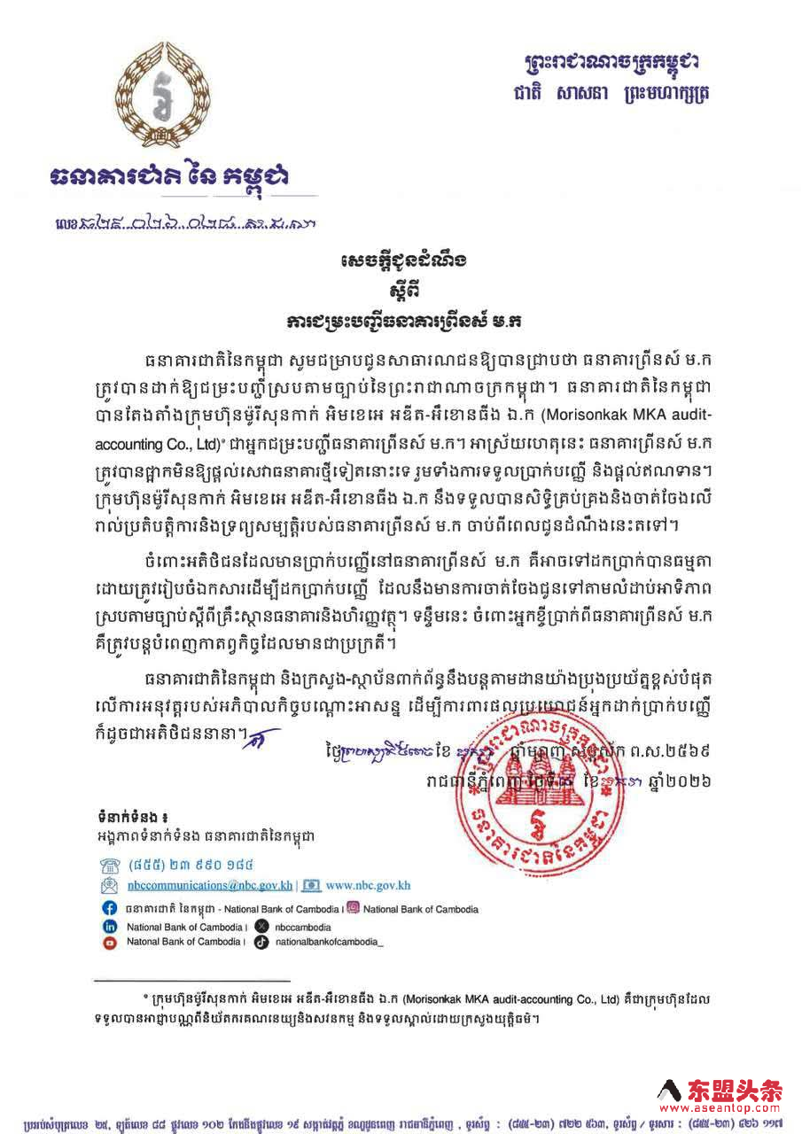 东盟头条金边1月8日电 1月8日,柬埔寨国家银行发布公告,正式宣布依法对太子银行启动清算程序。