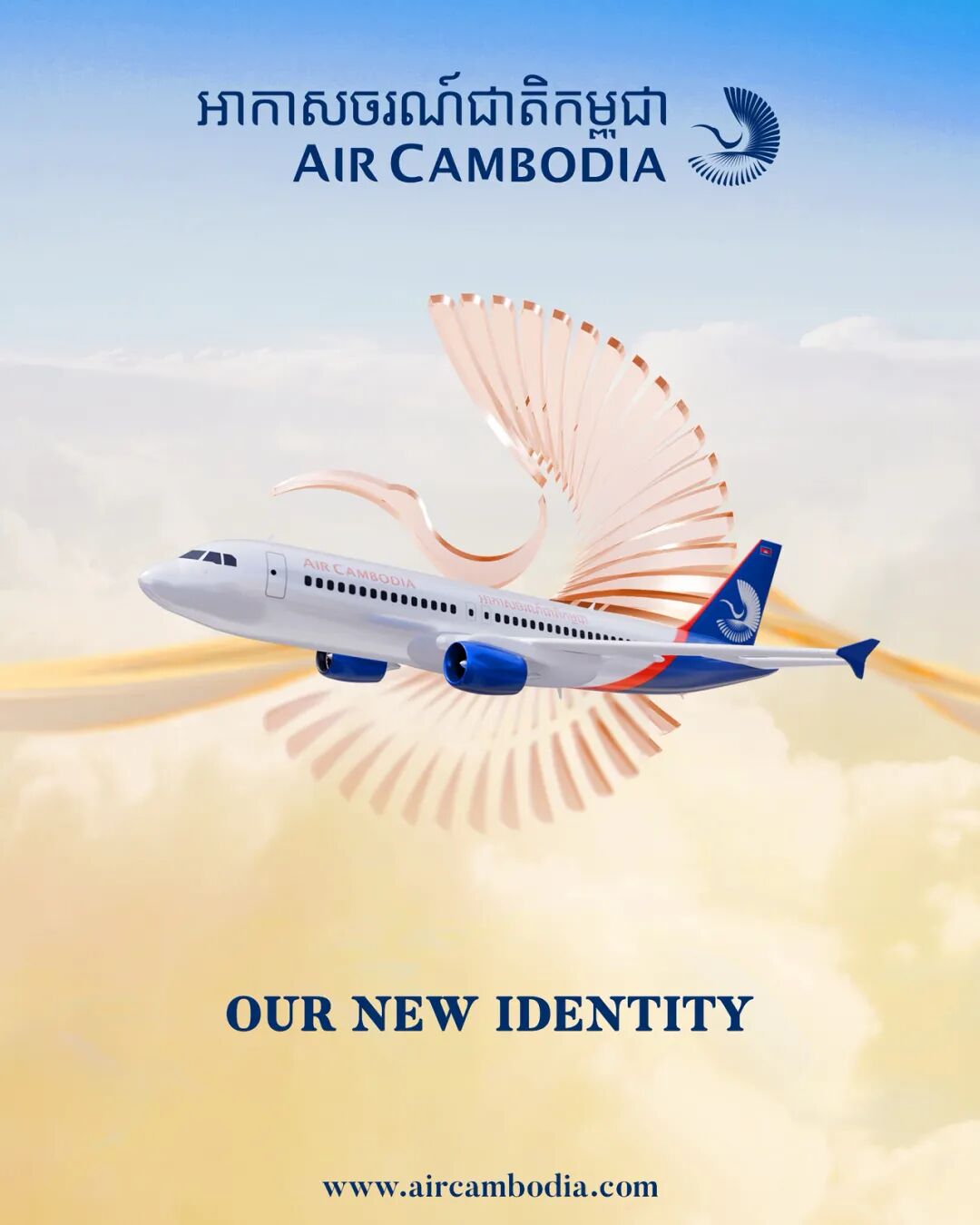 柬国航新Logo以柬埔寨国鸟——Tror Yorng(英文为Giant Ibis)为设计灵感。在柬埔寨传统文化中,Tror Yorng被视为守护、力量与神圣祥瑞的象征。新Logo以向上倾斜45度的鸟喙造型为引领,将神鸟的18片羽翼造型与飞机发动机叶片巧妙融合,寓意鹏程万里和澎湃动力。在视觉体系方面,新版涂装以皇家蓝为主色调,辅以金色、白色与红色,表达柬国航对天空信仰与专业权威的坚定追求,并着力诠释尊贵的高棉文化、宁净的飞行体验与温暖的空中服务。