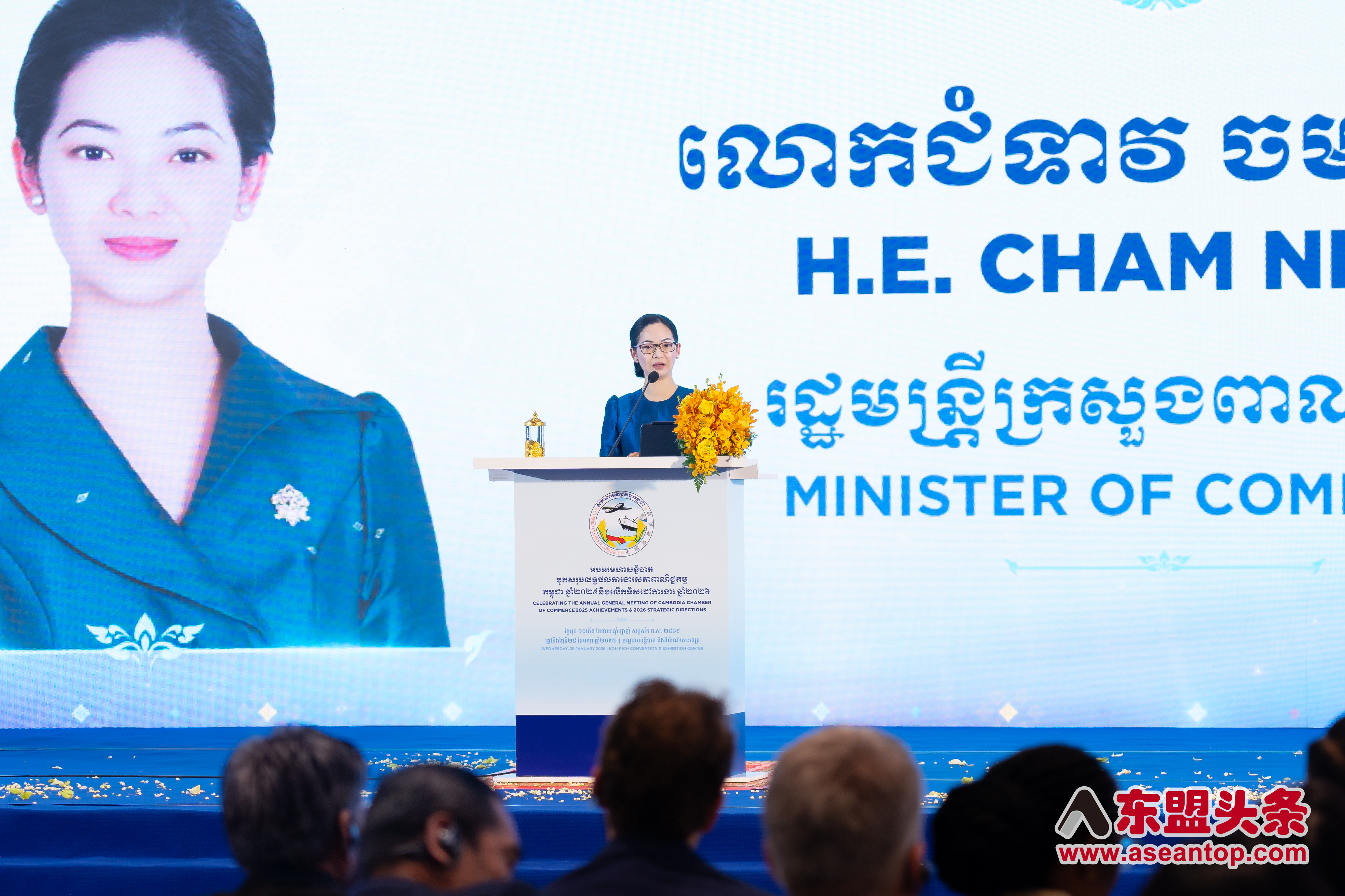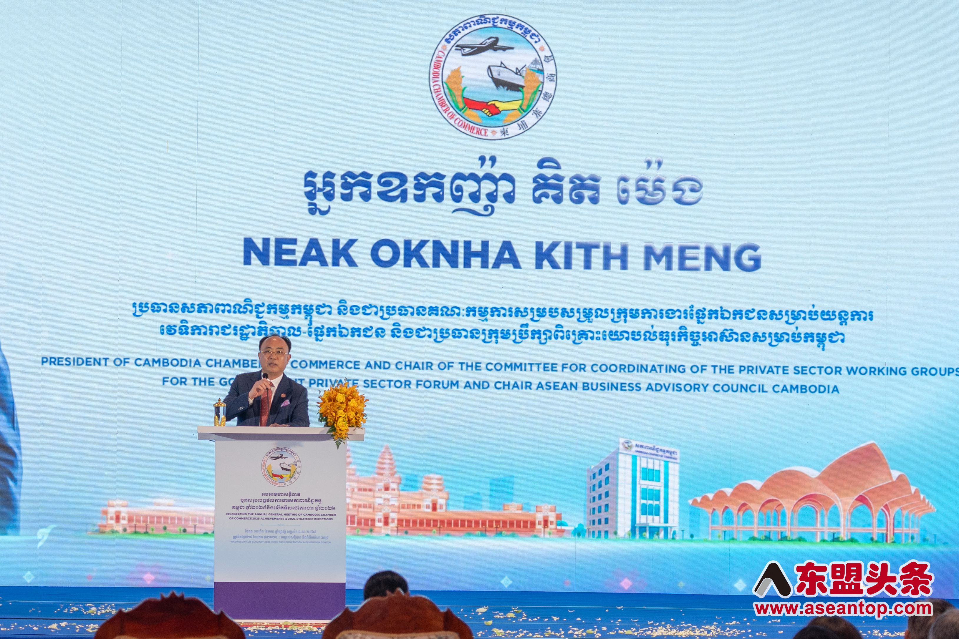 柬埔寨总商会2025年度工作成果总结暨2026年工作方向大会1月28日在金边举行,柬埔寨商业部大臣占尼莫和柬埔寨相关部委和机构的负责人、柬埔寨总商会主席兼柬埔寨东盟商务咨询理事会主席陈丰明、各国驻柬使节、各省市商会负责人、海外商会代表处代表,以及众多国内外商界人士参加本次活动。