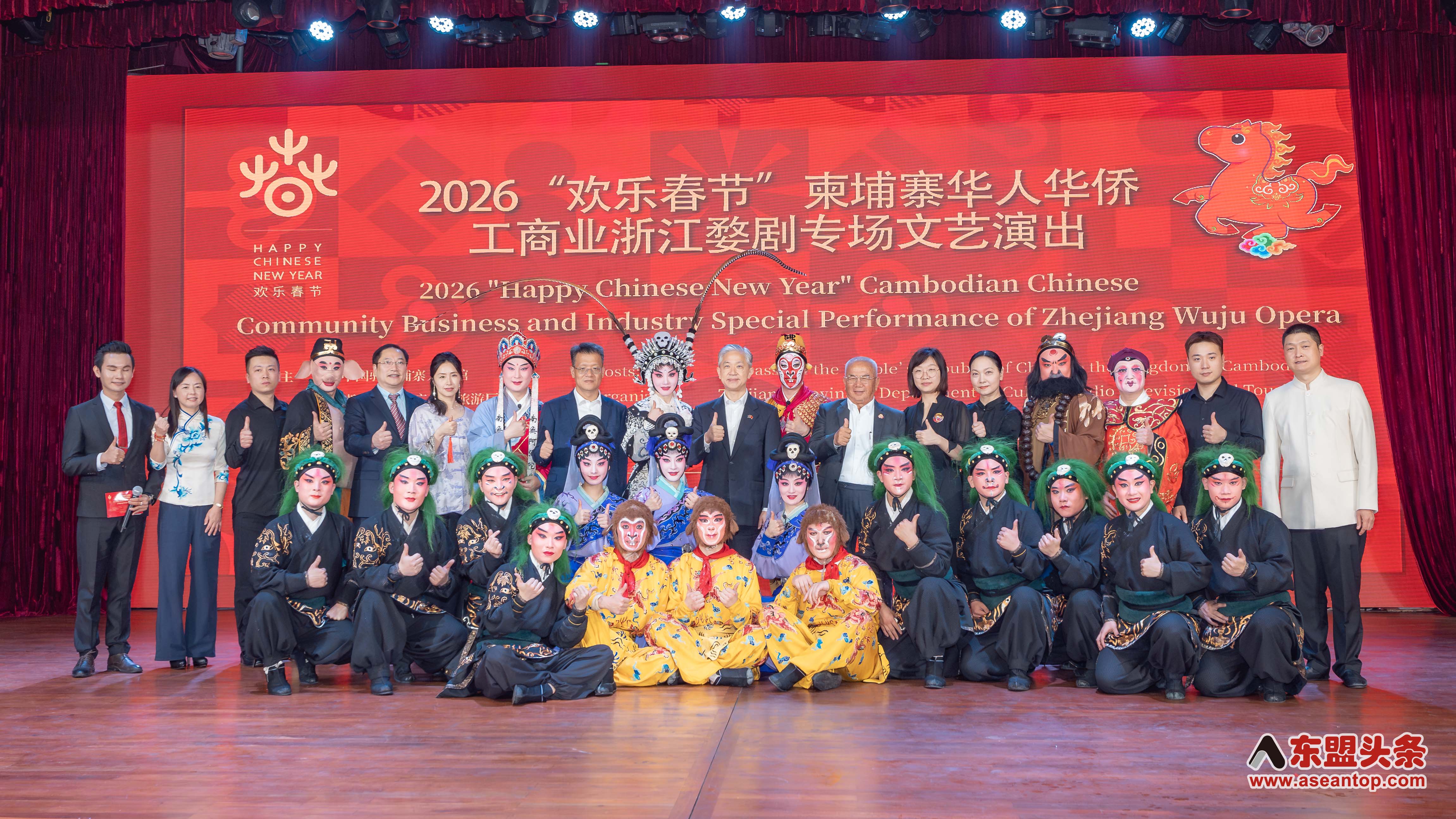 东盟头条金边2月7日电 2026“欢乐春节”浙江婺剧专场演出2月7日晚在柬埔寨金边四臂湾国家剧院举行第二场,该场演出专门为柬埔寨华人华侨工商业专场演出。中国驻柬埔寨大使汪文斌,柬华理事总会轮值会长蔡迪华,中国驻柬埔寨大使馆公使衔参赞赵海燕,浙江婺剧艺术研究院院长王晓平以及来自柬华侨界、商界的多位代表出席活动。