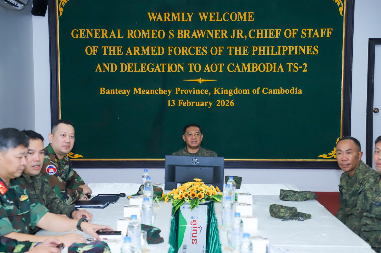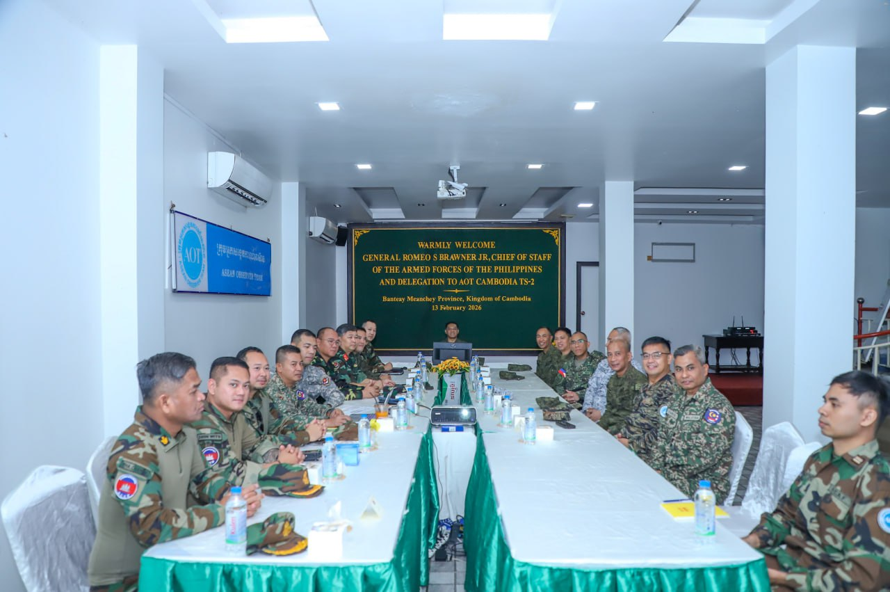 东盟头条金边2月13日电 据柬埔寨国防部消息,2月13日柬埔寨协调小组(CLG)协助东盟观察团(AOT)迎接菲律宾武装部队总参谋长罗密欧·布劳纳前往班迭棉吉省柬泰冲突地区进行实地考察。