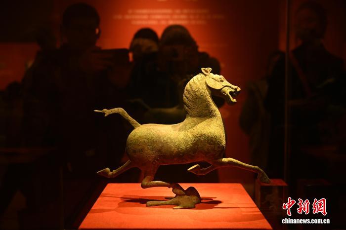2月11日,甘肃兰州,甘肃省博物馆的铜奔马复制品吸引观众。春节将至,甘肃省博物馆推出 “天驷——铜奔马特展”,以铜奔马为核心,串联起跨越千年的丝路文明记忆,为新春佳节注入文化气息。中新社记者 李亚龙 摄