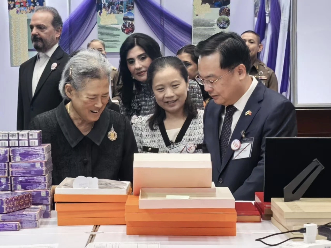 开幕式后,诗琳通公主首先来到中国驻泰使馆展台参观,并饶有兴致地询问了解使馆展品情况。张建卫向诗琳通公主介绍本次中国义卖商品特色和文化寓意。中国展台各种商品琳琅满目、特色鲜明,吸引众多顾客驻足选购。