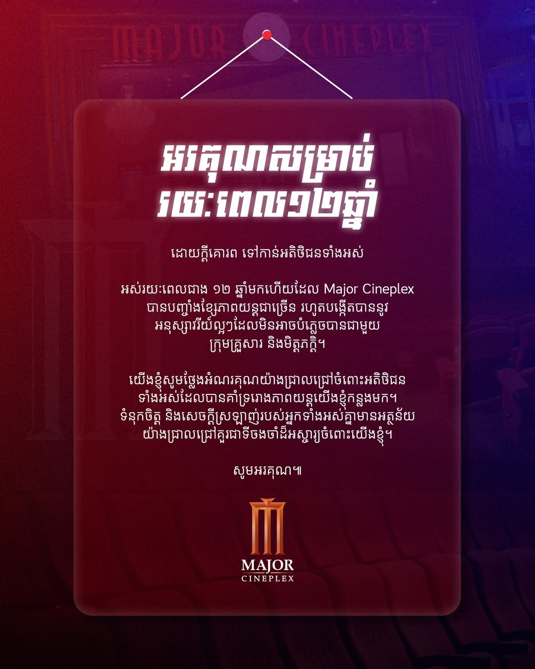 在官方声明中,Major Cineplex 向柬埔寨观众表达诚挚谢意。声明回顾称,过去十二年间,影院陪伴观众度过了无数银幕时刻,从人生第一场电影体验到与家人朋友共享的观影记忆,这些珍贵瞬间构成了品牌在柬埔寨的重要篇章。