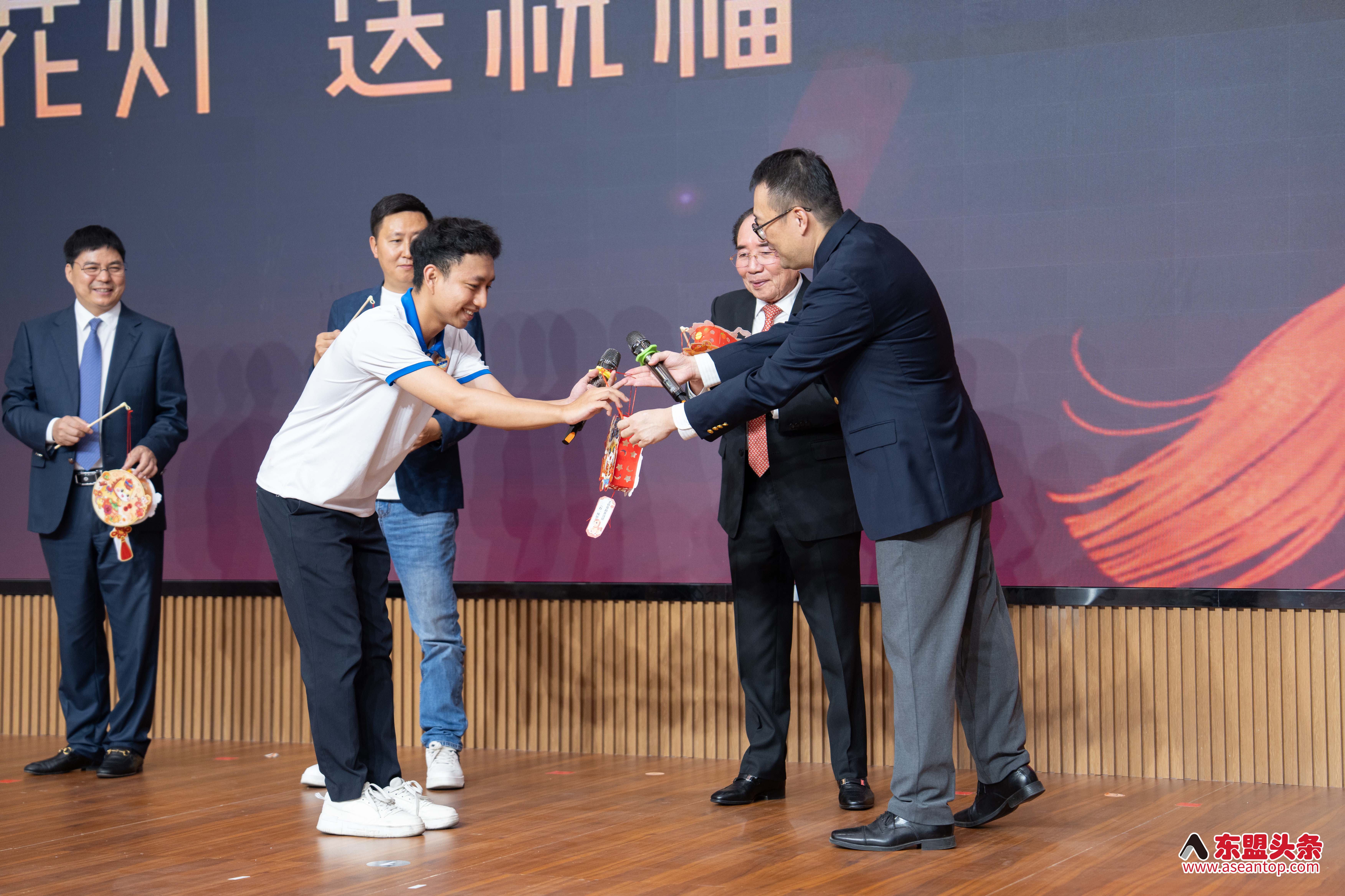 在“点亮花灯与送祝福”环节,五位领导和嘉宾共同触摸LED屏幕,点亮寓意“照亮新程”的主题花灯墙。璀璨的灯光瞬间点亮全场,象征着中柬友谊之光愈发璀璨,也寄托了对新一年的美好期许。随后,五位嘉宾手执花灯,邀请现场学生参与猜灯谜互动。学生热烈讨论,积极参与,在欢声笑语中感受元宵节的传统智慧与乐趣。