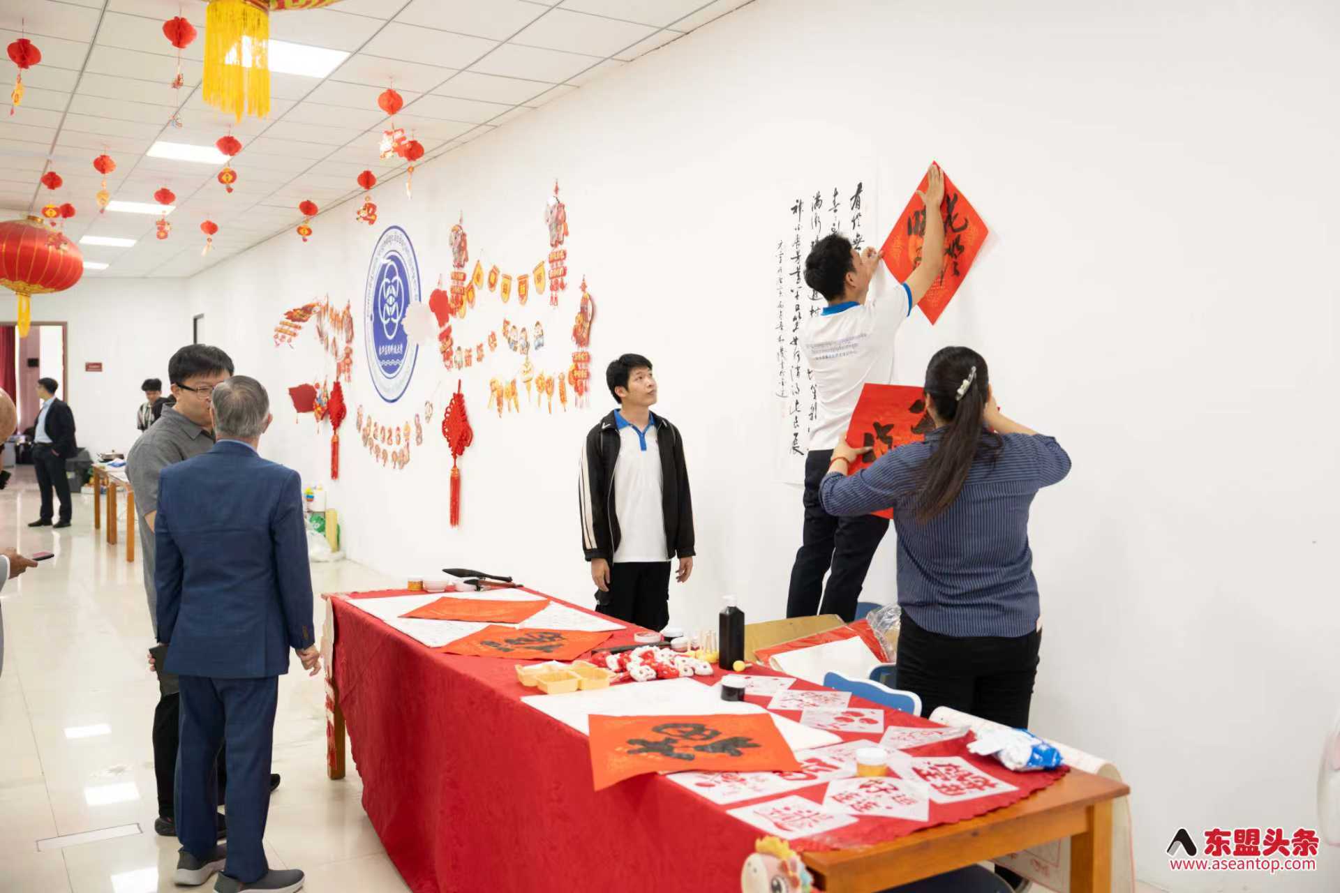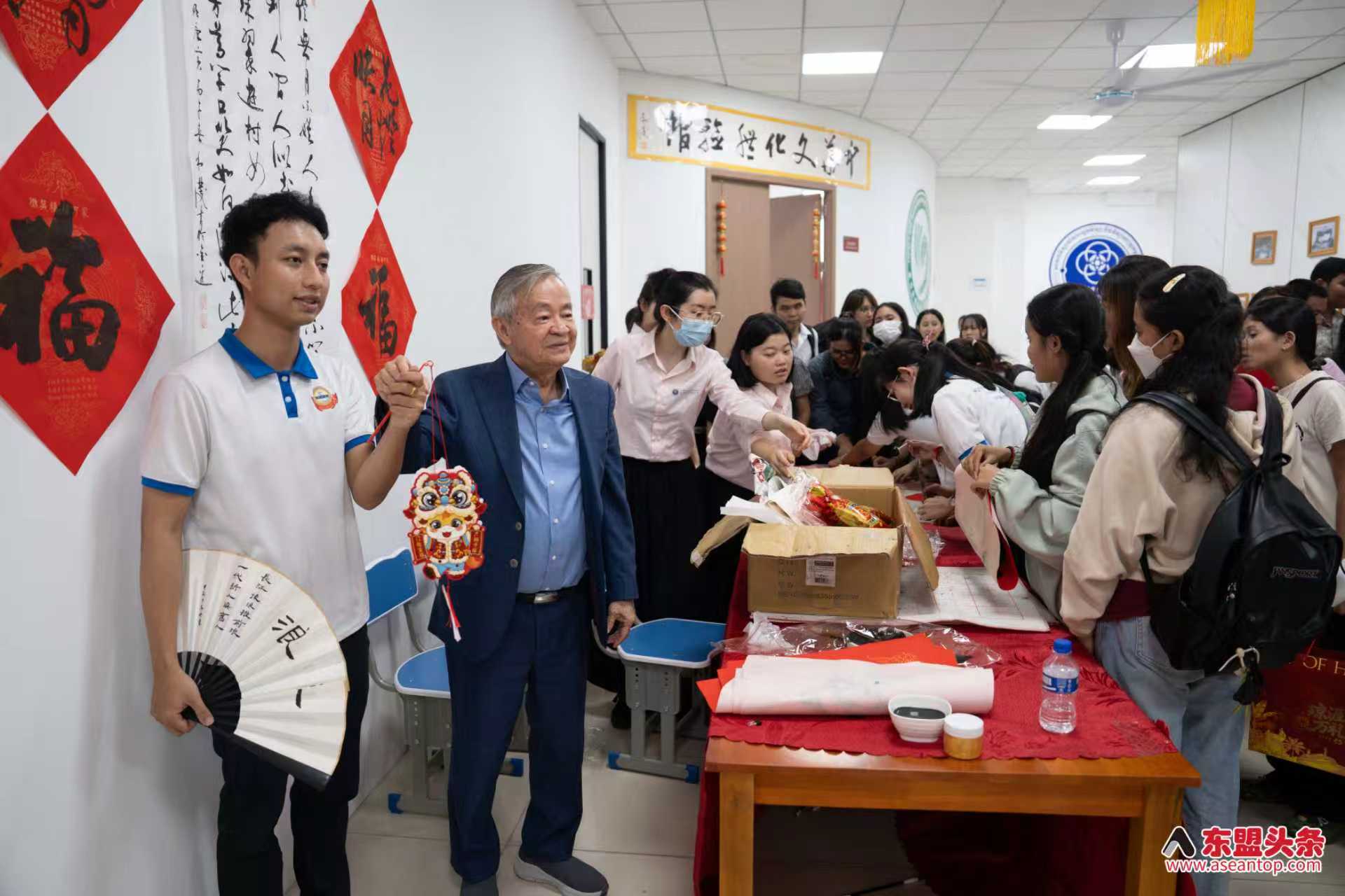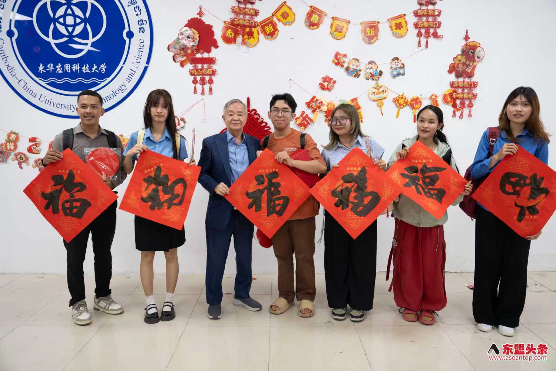猜灯谜环节后,活动迎来充满文化气息的“中华书法献礼”。四位领导和嘉宾现场为柬华应用科技大学及师生赠予柬埔寨中国书画协会冯利发主席的亲笔墨宝。现场学生踊跃参与,读出墨宝上的吉祥字句,在翰墨书香中感受到了中华文化的别样乐趣。