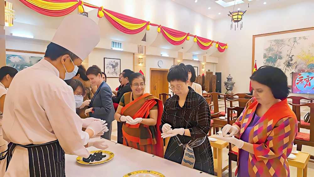 活动现场展示中国传统戏曲和书法,设置茶道、漂漆、拓印等互动体验区,来宾共同欣赏古筝合奏及使馆女外交官和家属表演的“国韵”旗袍秀,气氛热烈友好。
