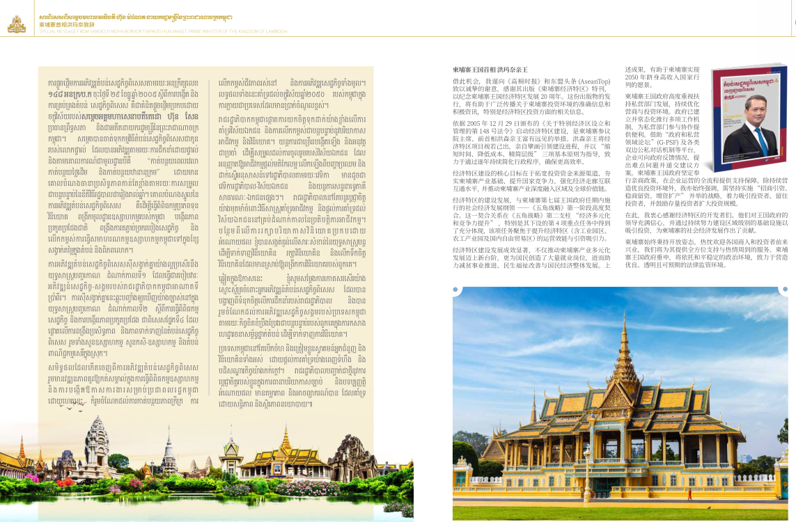 为纪念柬埔寨经济特区成立20周年和进一步吸引投资,柬埔寨发展理事会授权东盟头条(AseanTop)组织编辑《柬埔寨经济特区》特刊。该特刊采用柬文、中文、英文三种文字编写,由东盟头条历时一年编辑而成,并由高棉时报社出版。