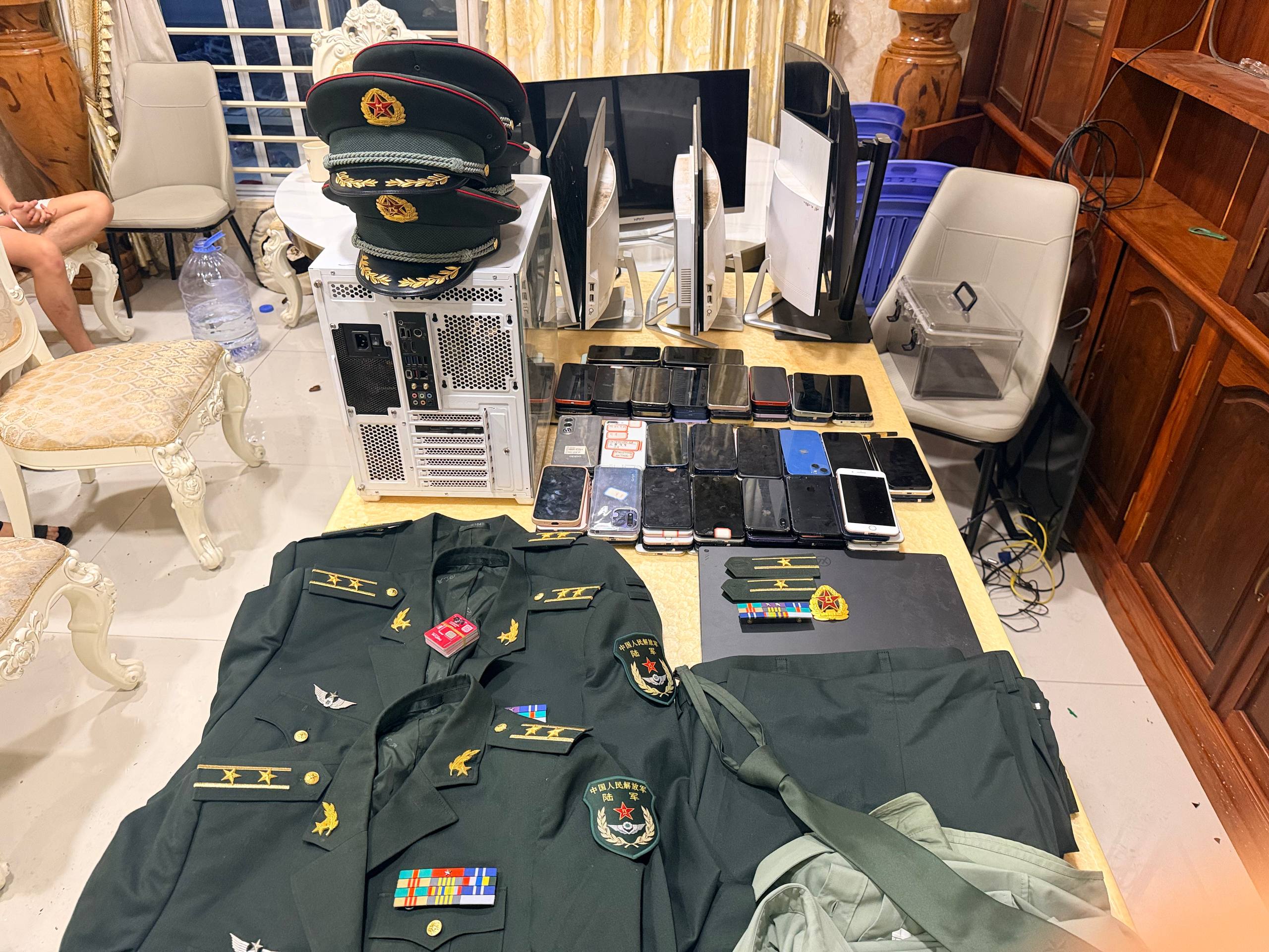 据警方透露,该团伙以冒充“中国人民解放军”为主要作案手法,通过视频通话、语音电话等方式,对中国境内受害者实施诈骗。为增强欺骗性,嫌疑人现场使用多套仿真度高的中国军人制服及配套物品,包括军装、军帽、肩章及勋表等,通过穿戴制服、配合固定话术及视频画面,对受害者施加心理压力,从而诱导转账。