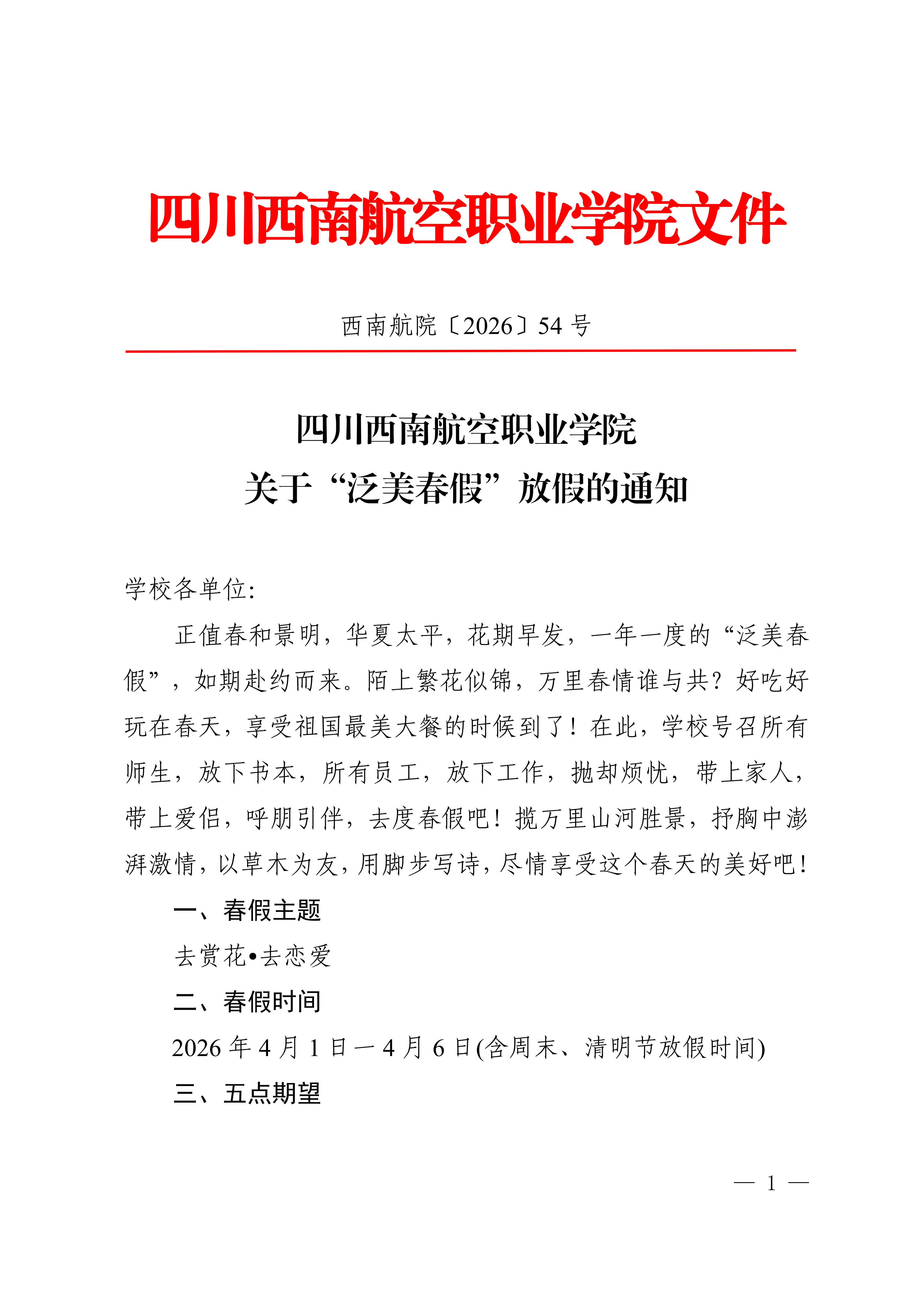四川西南航空职业学院在官网等渠道发布的通知显示,学校号召所有师生放下书本和工作,携家人、爱侣或朋友“去度春假”。春假主题是“去赏花,去恋爱”,时间从4月1日至6日。