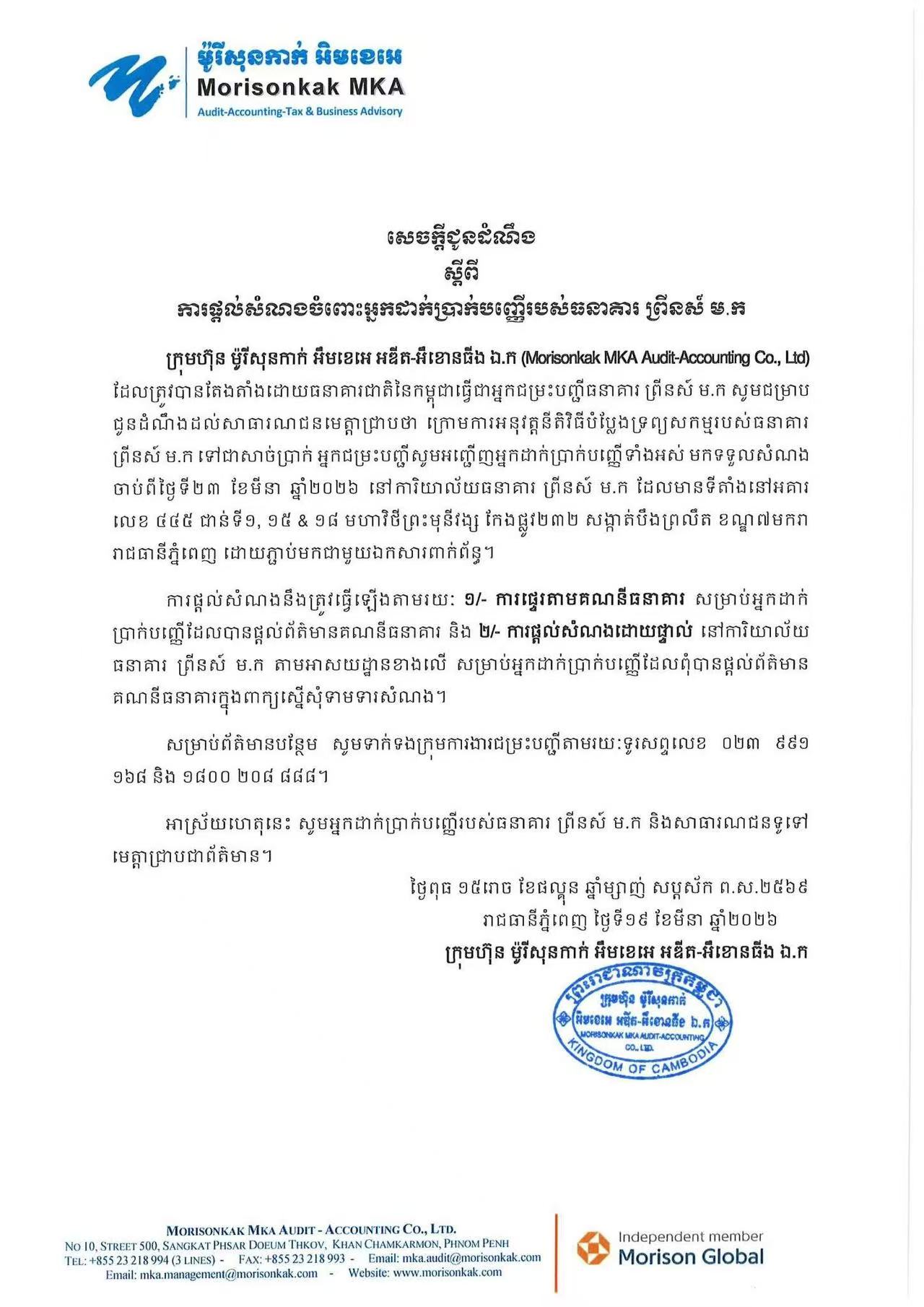 公告指出,受柬埔寨国家银行委托,清算机构已依据资产变现程序推进太子银行的清算工作,并开始向所有已登记的存款人发放赔偿款项。