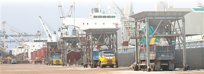 关丹港码头,卸船机正在作业。记者 白元琪摄