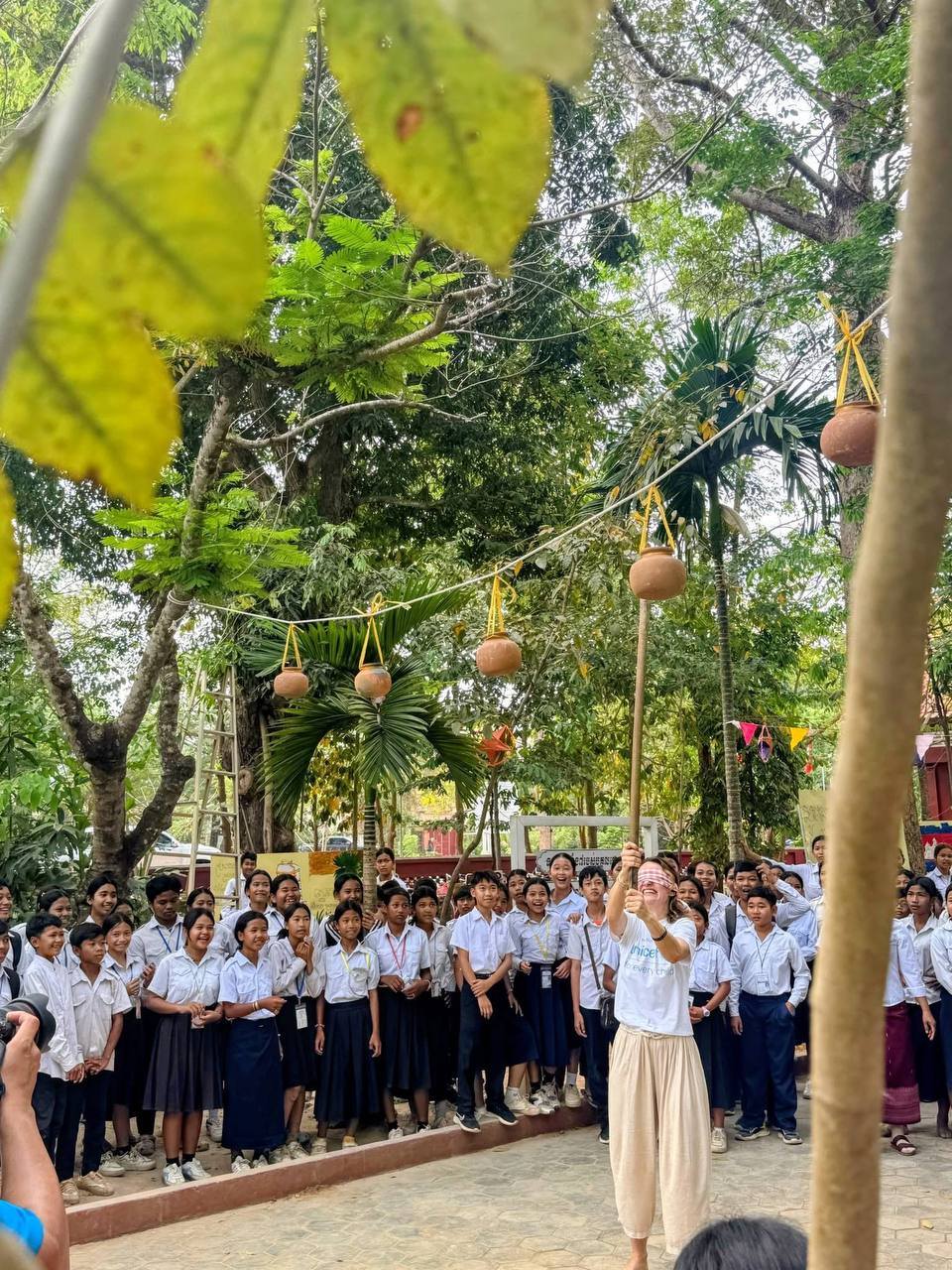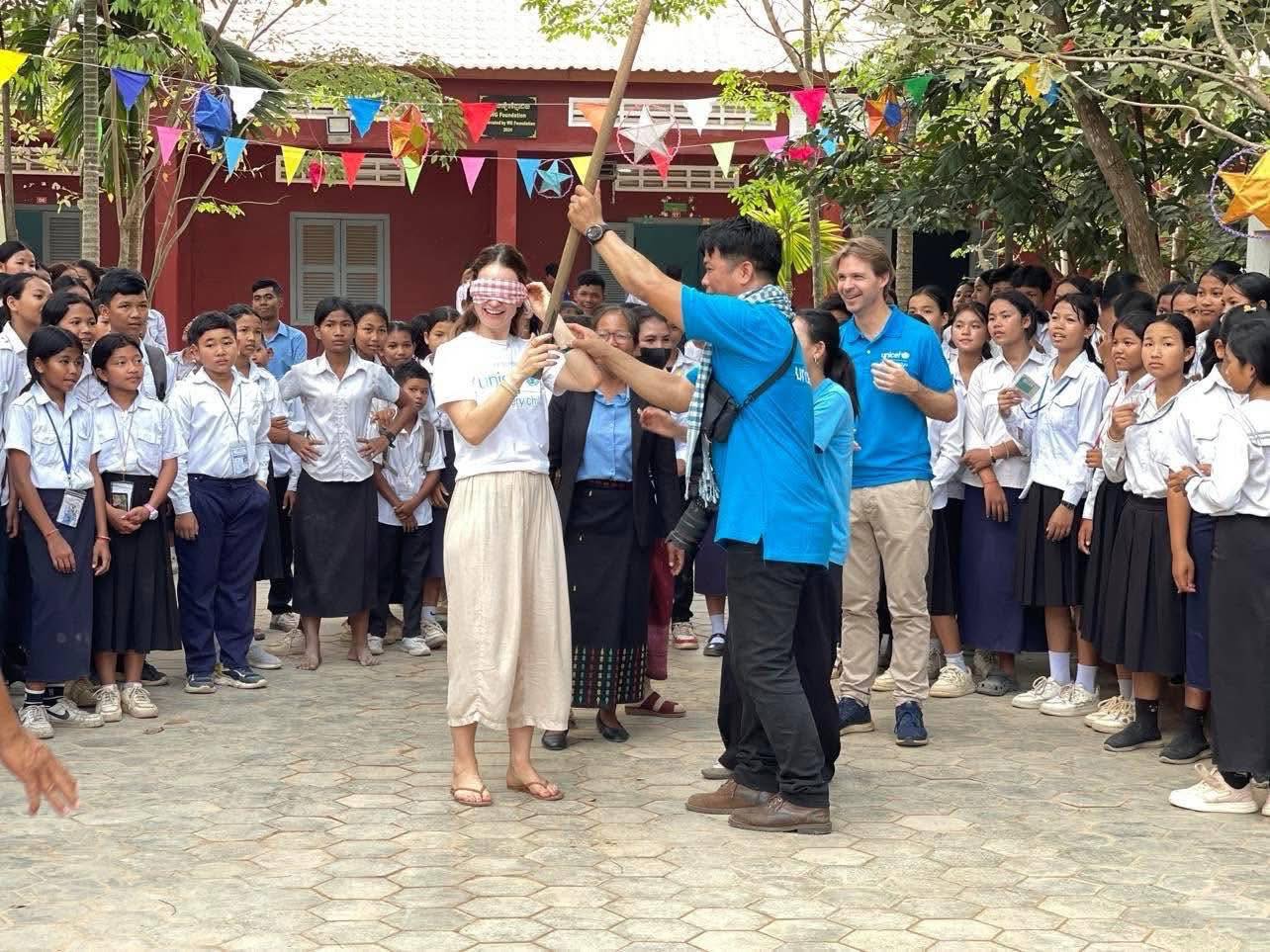 活动期间,莉莉·詹姆斯还特别参与了柬埔寨传统娱乐游戏,与学生们一起互动体验。大家在轻松愉快的氛围中欢笑不断,现场洋溢着温馨与活力,也展现出柬埔寨传统文化的独特魅力。