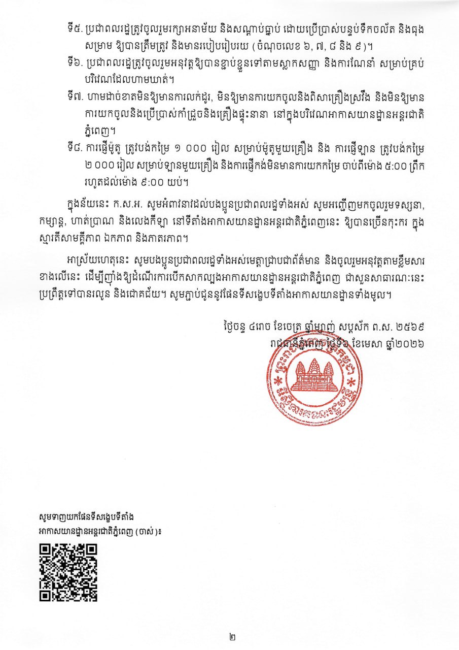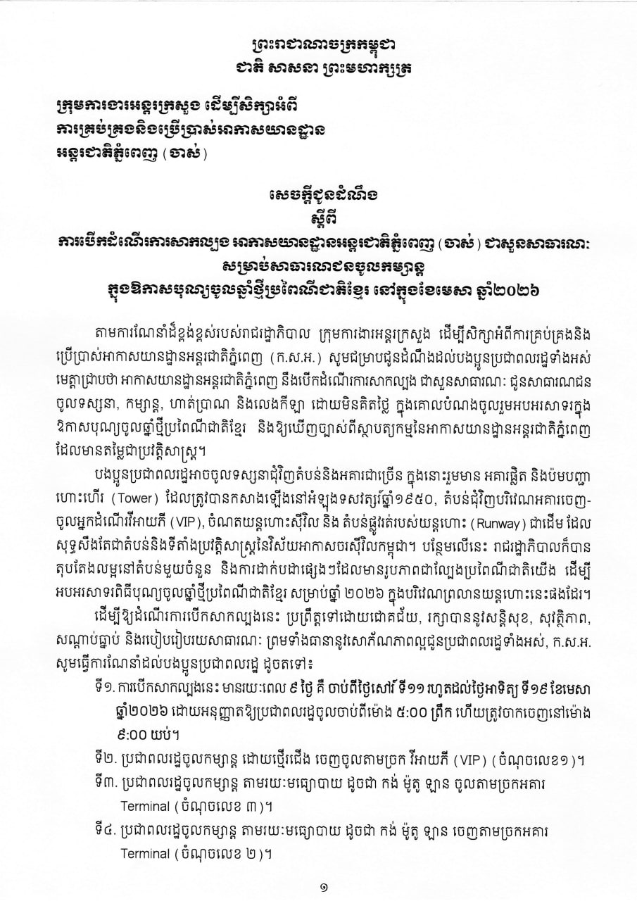 东盟头条金边4月6日电 柬埔寨相关跨部门工作组4月6日发布通告称,金边机场旧址将在2026年柬埔寨传统新年期间(4月14日至19日),试点开放作为公共公园,供民众免费进入参观、休闲、锻炼与开展体育活动,以共同庆祝新年节日。