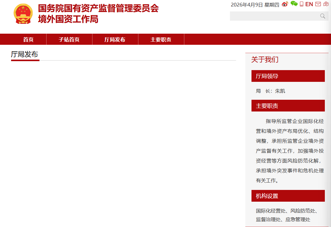 根据中国国务院国资委官网信息显示,国务院国资委新设境外国资工作局,朱凯担任局长。