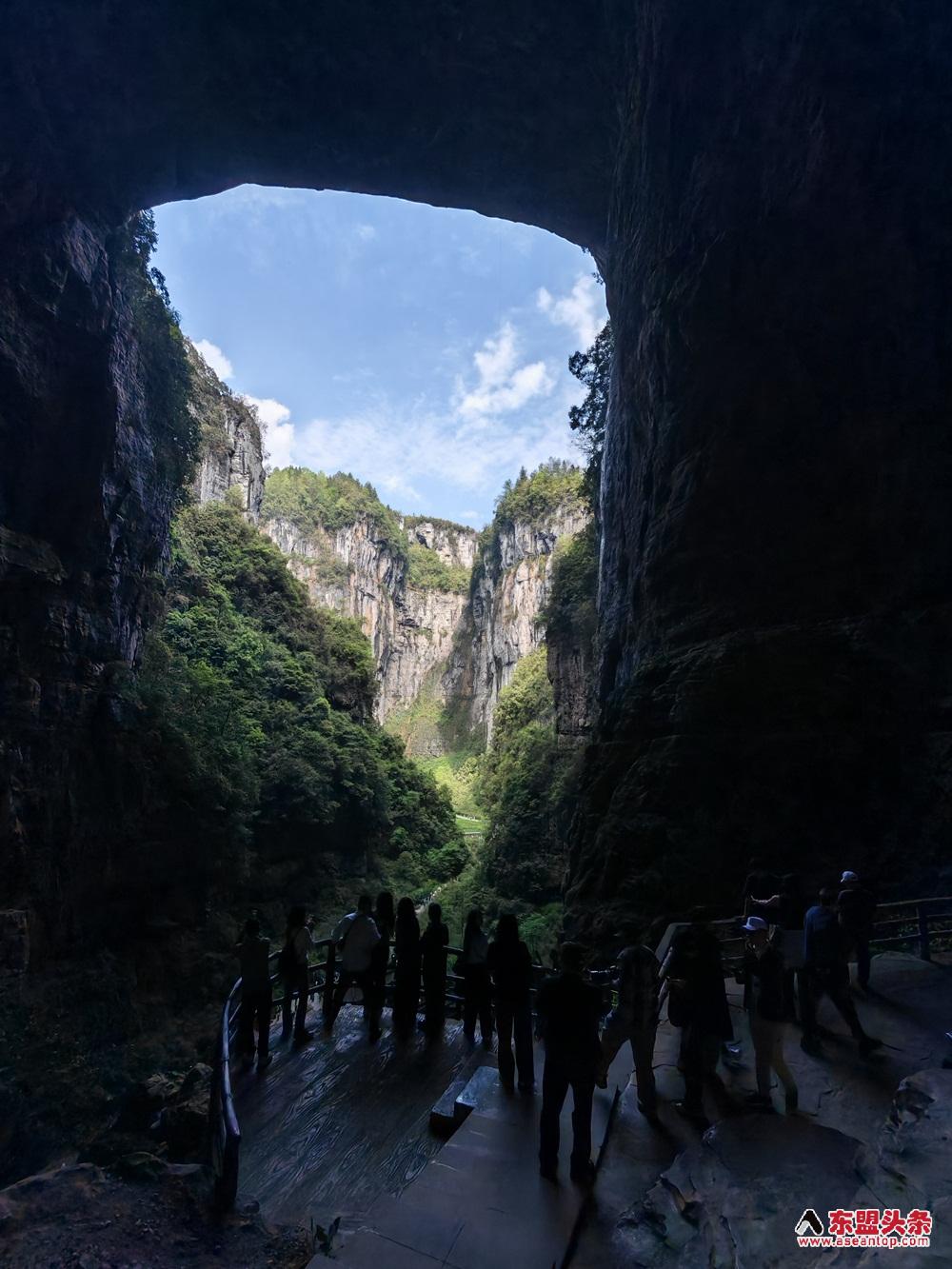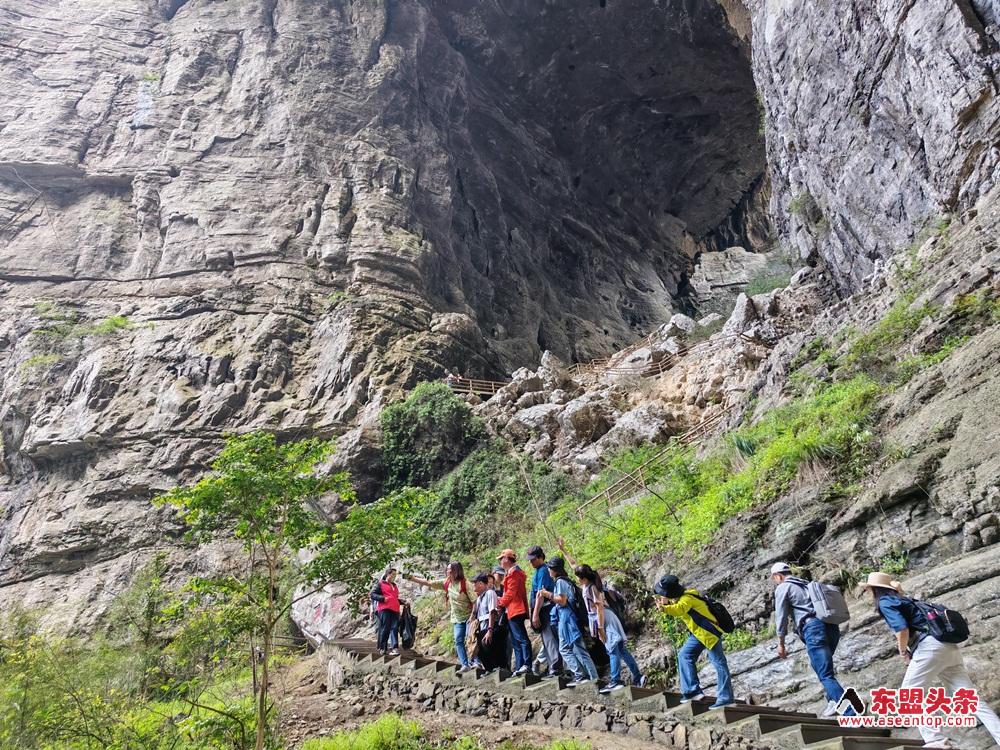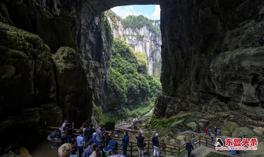 东盟头条重庆4月17日电 站在天生三桥的天坑底部,马来西亚川渝总商会副会长刘素华仰头望向天龙桥,竖起大拇指,以身后巨大的石拱为背景留影。这是景区热门打卡点——天龙桥的桥洞天然形成一个“点赞”的手势。“大自然的鬼斧神工,太震撼了。”她说,这里的景观很原始,山势雄奇挺拔,流水清澈见底。
