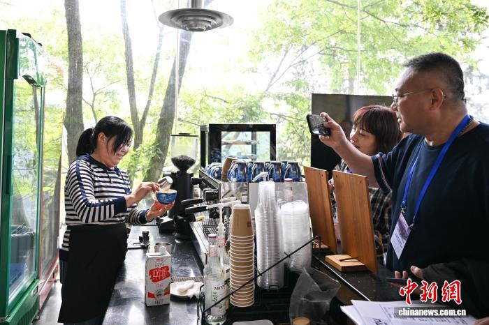4月17日,冉光芳(左一)在为游客冲咖啡。中新网记者 何蓬磊 摄