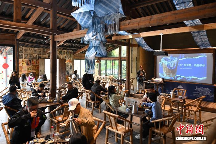 4月17日,廖倩(台上讲解者,身着扎染长裙)在向游客分享扎染技艺。中新网记者 何蓬磊 摄